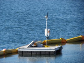 Yellow boom holding turbidity curtain to contain disturbed mud, with raft containing turbidity sensors.