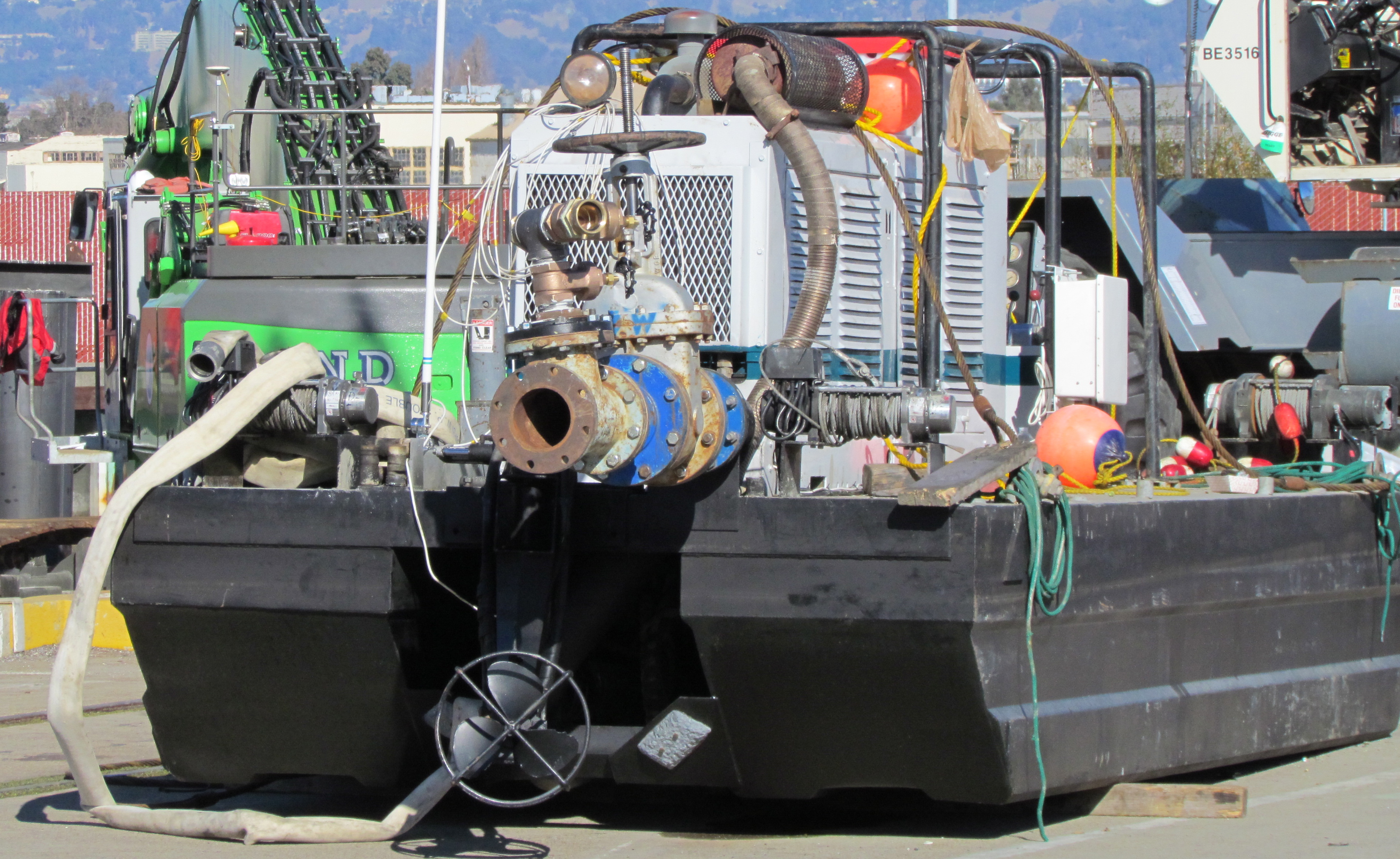 Raft with dredging pump. Hose connects to 4" valve at rear for vacuum dredging under wharf.