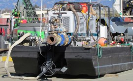 The open water dredging is conducted from a barge using a special clamshell scoop that allows virtually no mud to drip out of the jaws when hoisted out of the water. This helps to minimize dispersing fine contaminated sediment in surrounding water, which could necessitate repeat dredging. The scoops of mud are held in the air for about 30 seconds to drain the water before being hoisted over to a dump truck. The trucks are driven a few hundred yards to a special drying pad to dump the mud. As the dredge barge moves out of arms length of the wharf, it will have to deposit the mud in a hopper barge that will then be moved next to the wharf where the mud will be unloaded and put into the dump trucks.