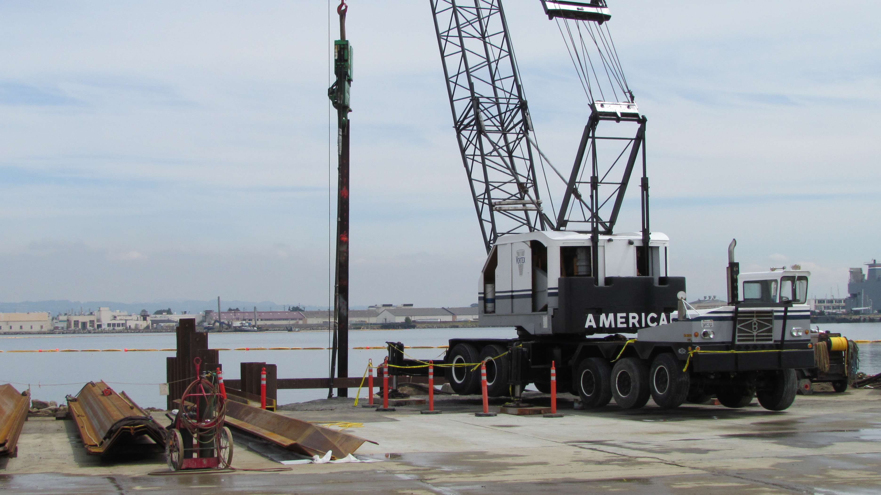 Hoses carry vapors to large pipe that leads to filter system. Vapors are created using high-temp electrodes that extend 30 feet into the ground. Seaplane Lagoon and San Francisco are in background.
