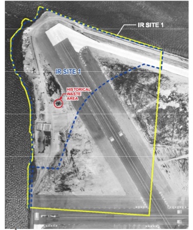 Site 1 indicated by blue line. Yellow line indicates entire area used by Navy as a disposal area from 1943 to 1956. Red indicates waste pit that caused groundwater contamination. Navy photo and overlay.