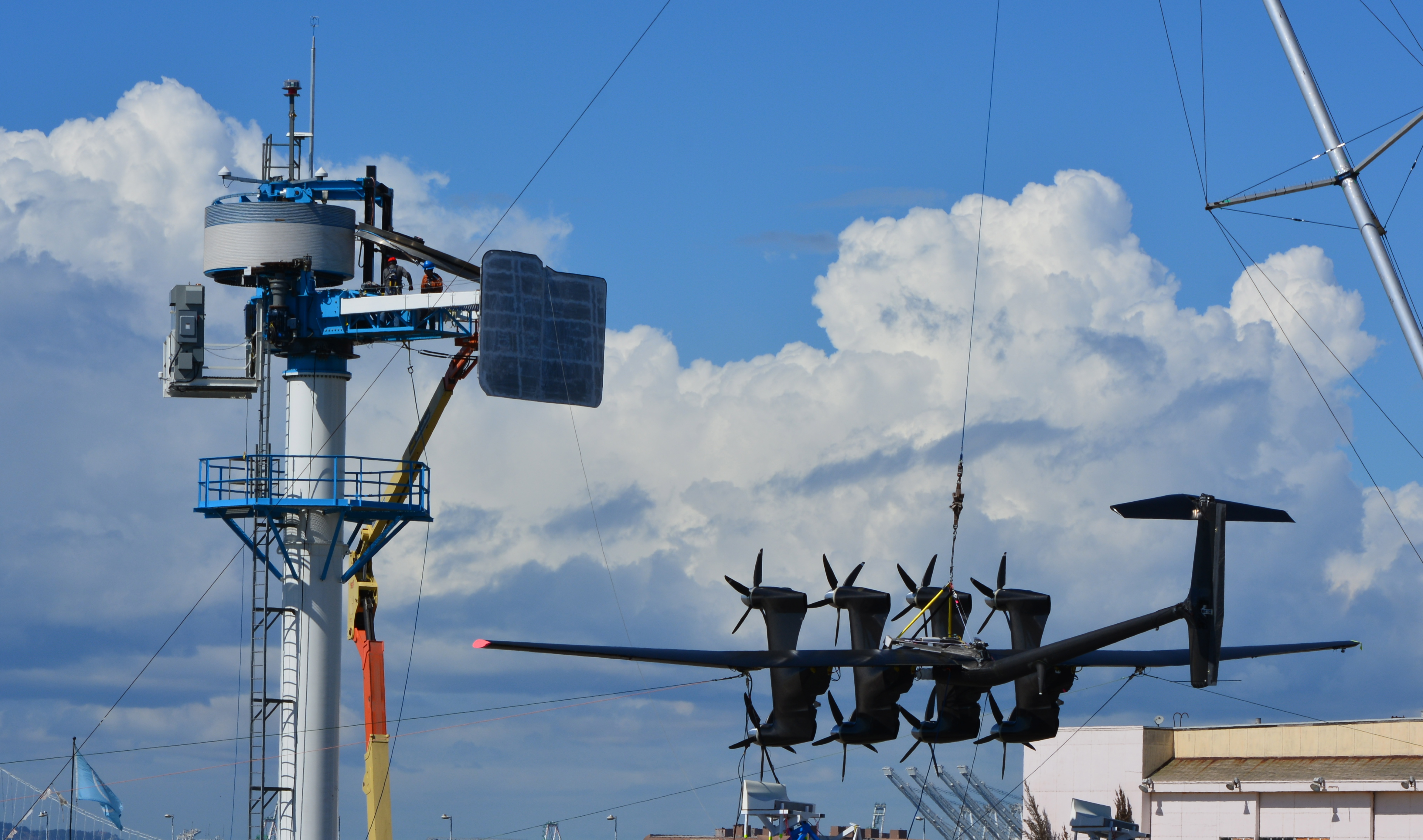 Makani energy kite undergoing testing at Alameda Point on October 1, 2015. Kite is suspended by mast on right. Tower on left is where the kite will be docked with propellers facing upward.