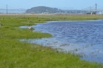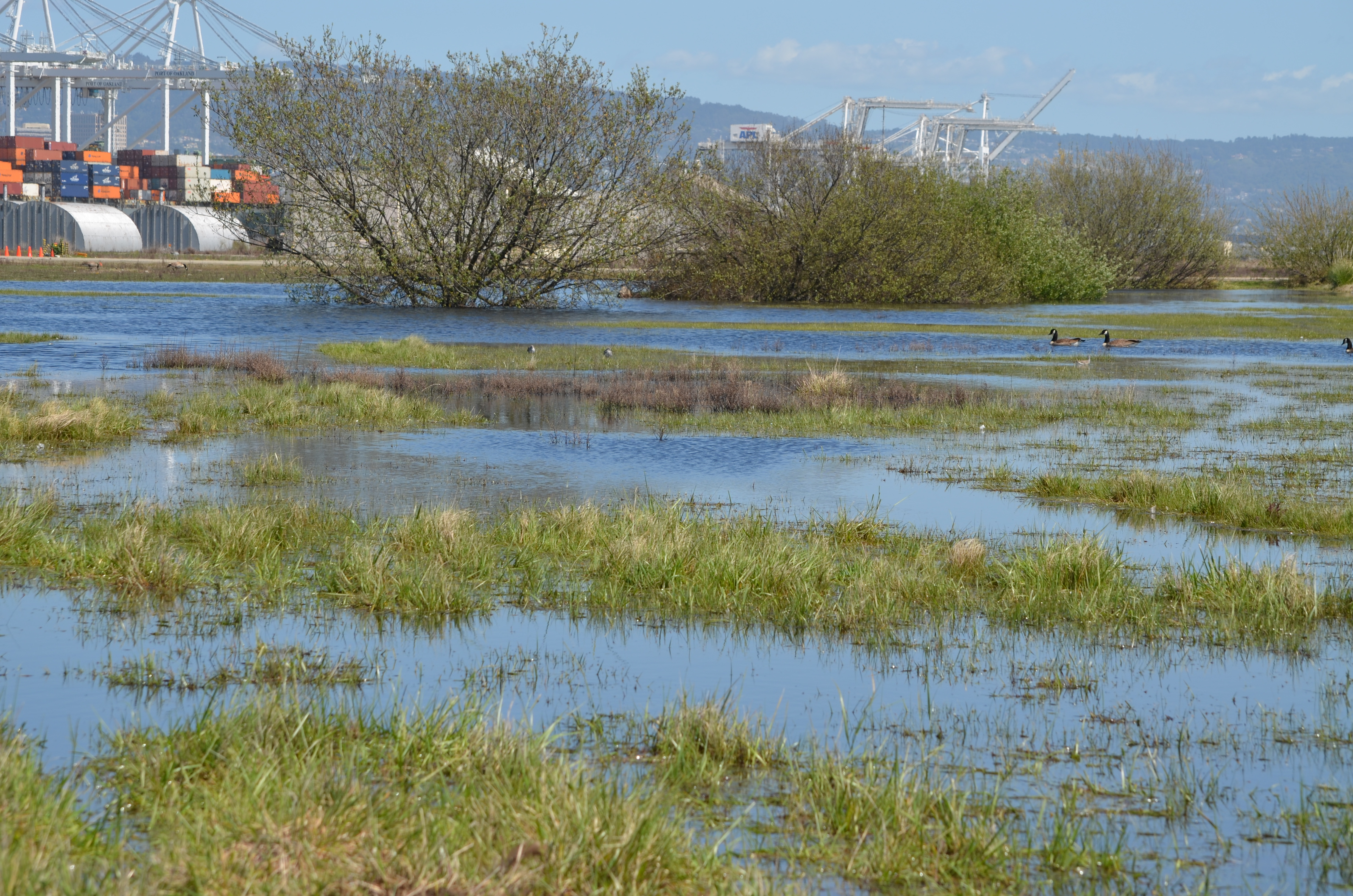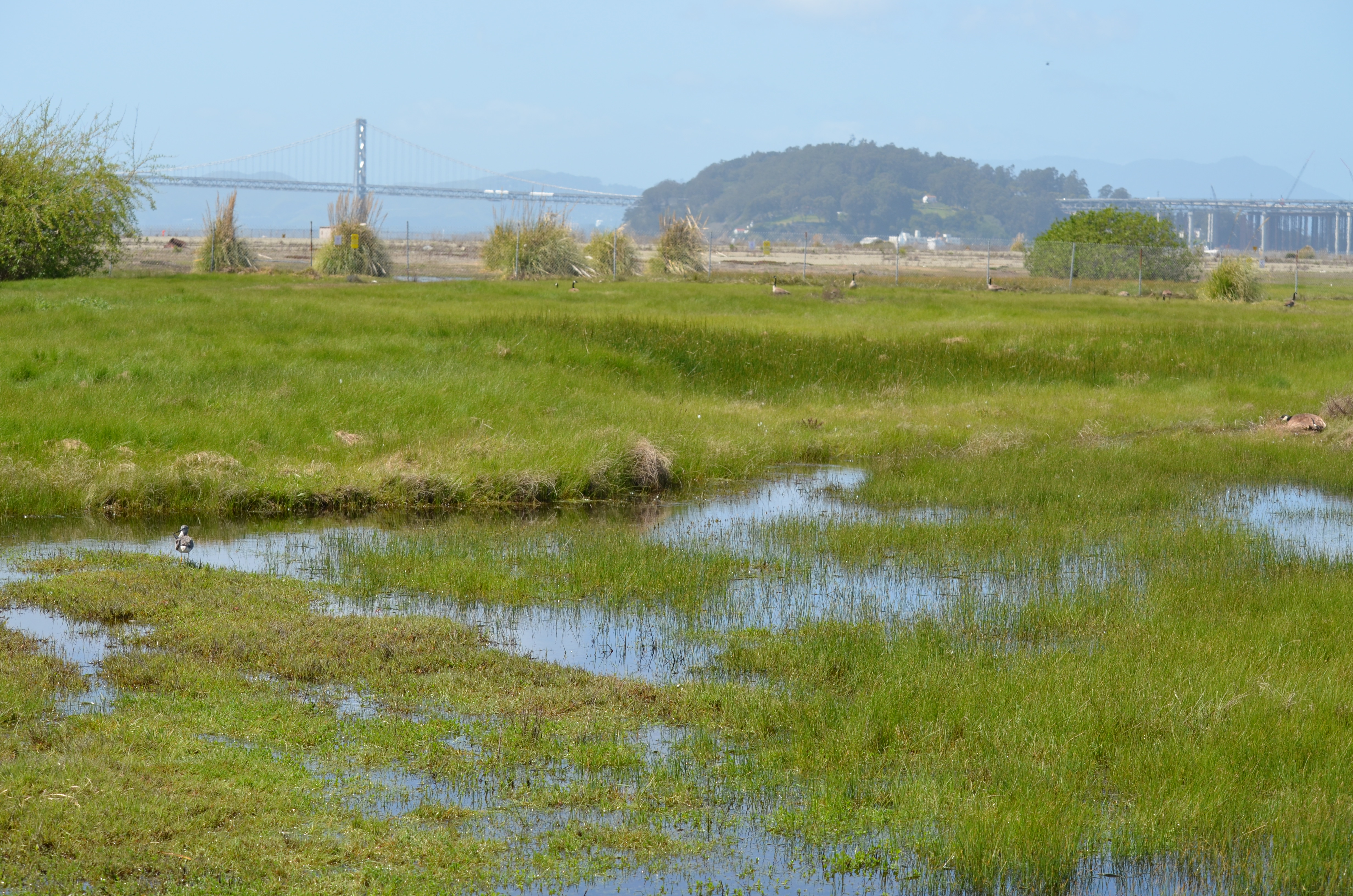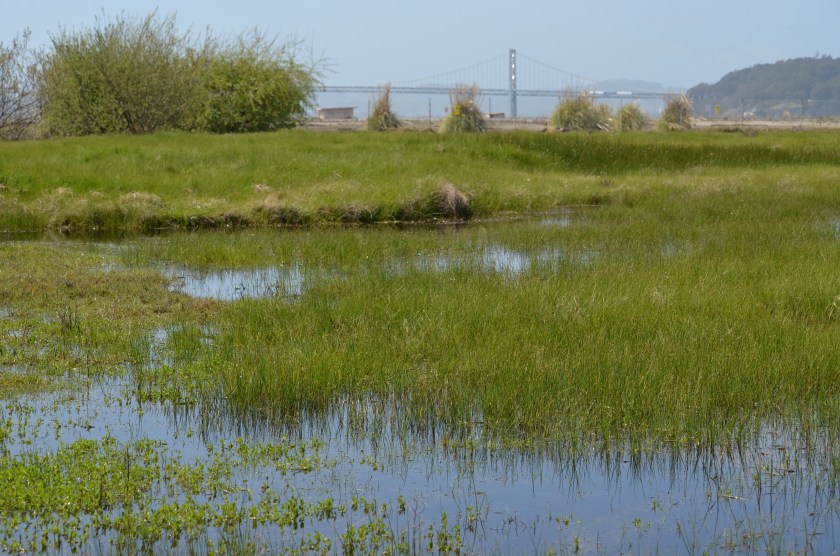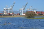 Coastal marsh on Oakland estuary at Alameda Point Site 34. Port of Oakland on left. Old runway area on right. Looking east toward Alameda Main Ferry Terminal.