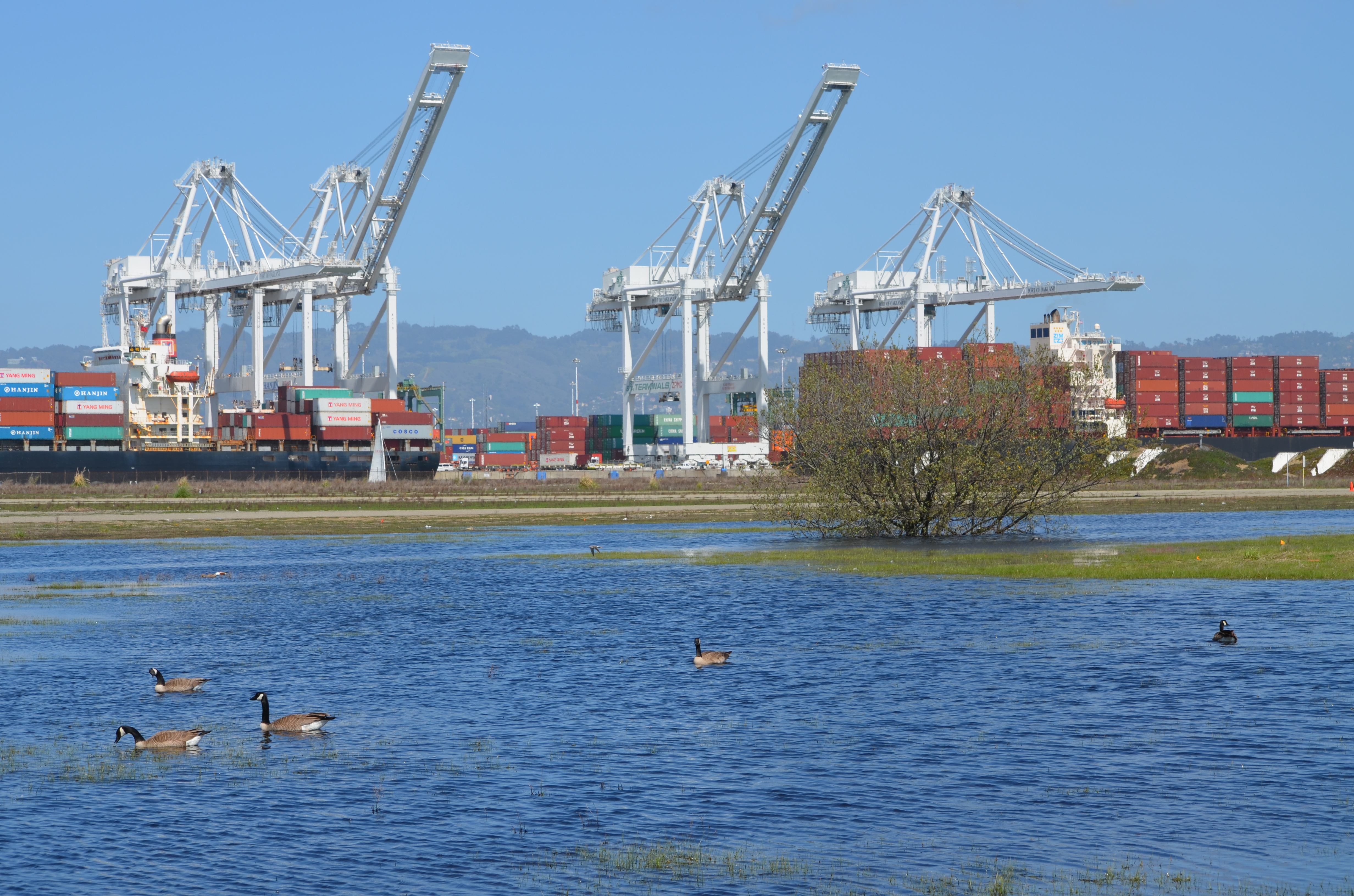 Site 34 starts at concrete slab on far side of tree. Port of Oakland on right. In late 1800s and early 1900s, trains travelled on tracks along the estuary where tree and slab are.