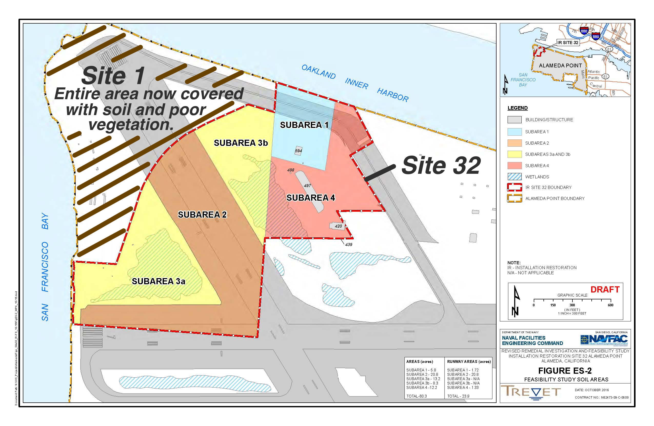 The Navy will present options on possible ways to clean up 60 acres at Alameda Point slated for a regional park on Thursday night. The draft cleanup options for Site 32 represent the culmination of 25 years of groundwater and soil studies that began before base closure was announced. Only five acres have been flagged for cleanup, but uncertainty about what lies beneath the pavement and structures requires a conservative approach.