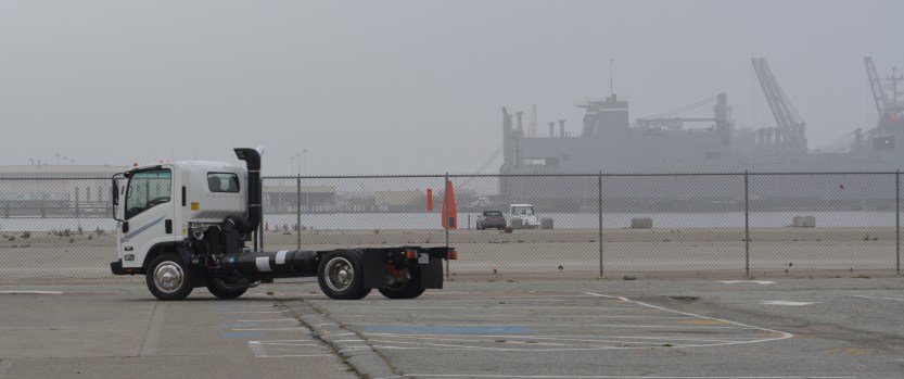 Wrightspeed demonstration vehicle at Alameda Point. Seaplane Lagoon and maritime ships are in the background. Photo courtesy of City of Alameda.