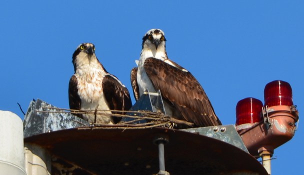 Previous Image Next Image Osprey pair at beginning of 2014 light pole nest Osprey pair deciding on whether to set up nest on light pole in parking lot at Alameda Point 2014.
