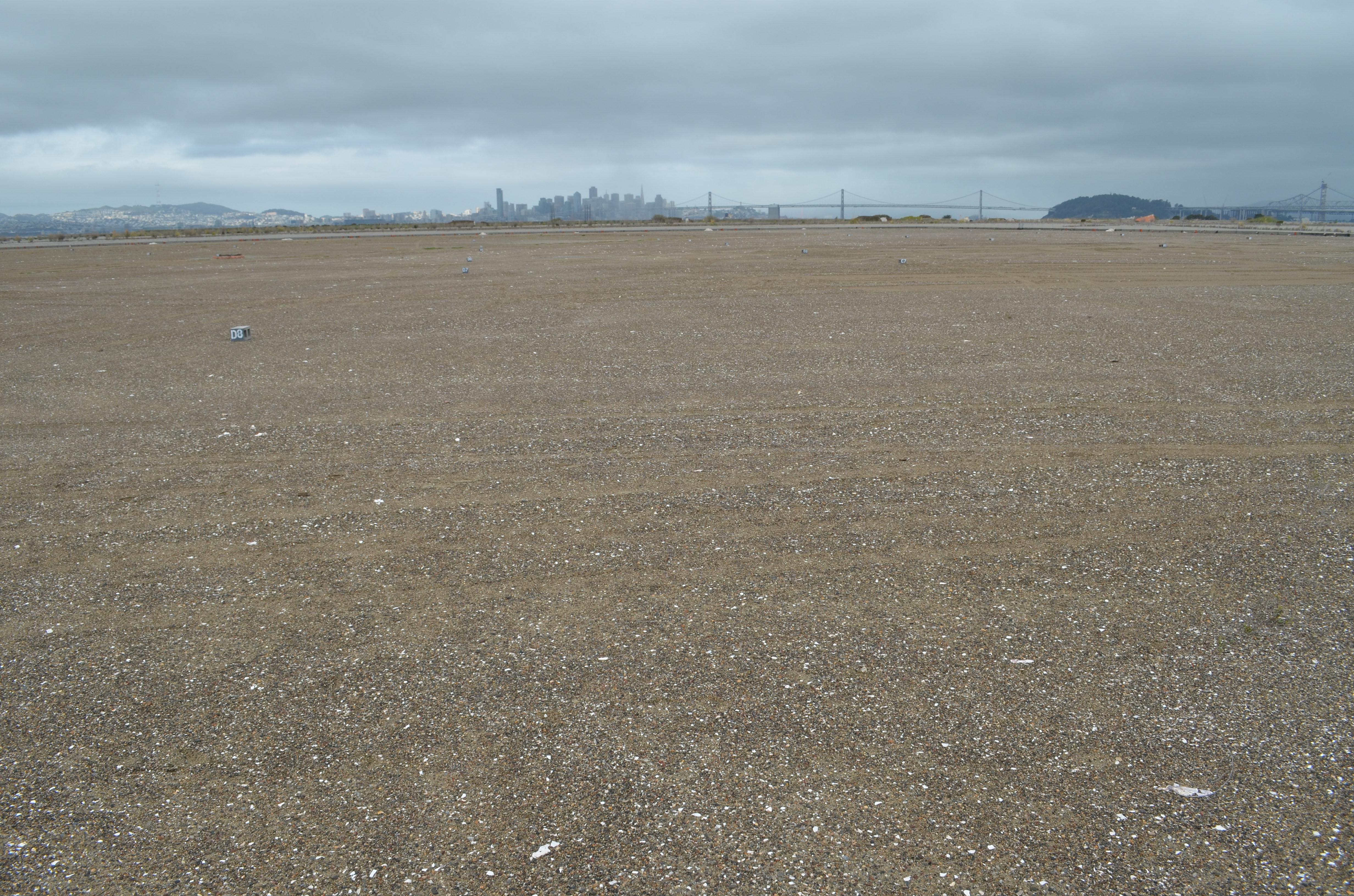 Fresh layer of sand on Alameda Point least tern nesting site. Looking south, with ships in San Francisco Bay in background.