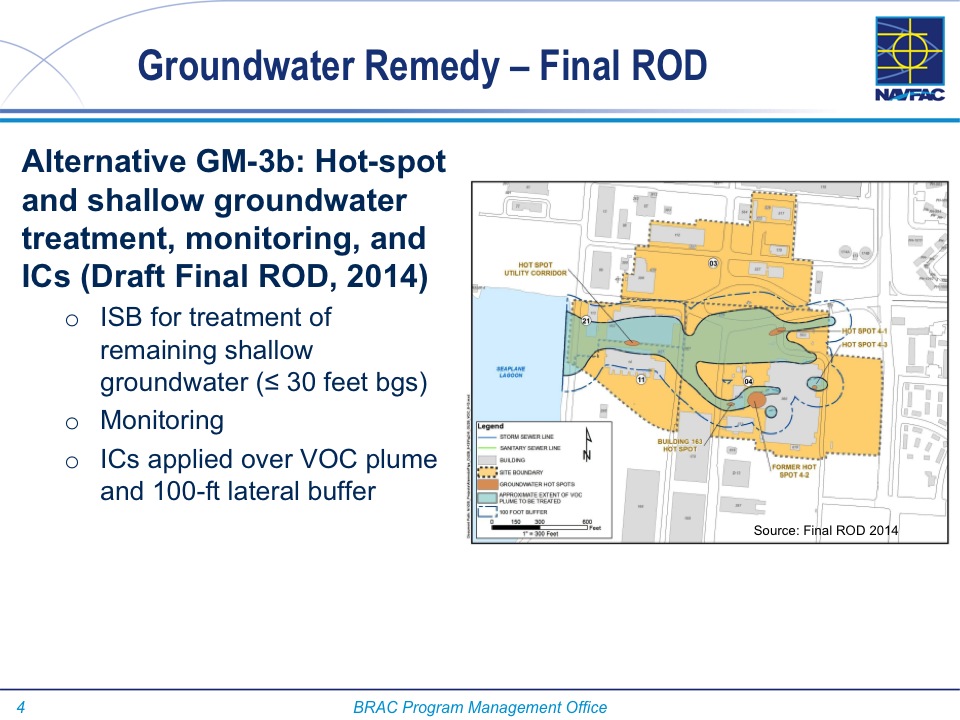 “When groundwater contamination is involved, such as at the two former gas stations, cleanups often involve multiple phases, each building upon earlier accomplishments,” said Dr. Peter Russell, who has been reviewing Navy cleanup plans and preparing cleanup-related documents on behalf of, and at the direction of, the city since 1997. “As long as all imminent health and environmental risks are eliminated early on, often the most cost-effective approach to complete remediation is incremental,” explained Russell. “In contrast, a massive initial remedial effort that is sure to achieve all remedial goals in one pass would likely involve over-sizing the treatment system, which is more disruptive and expensive than a phased approach.”