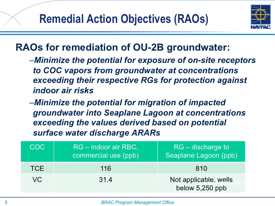 The goal of the cleanup is to minimize the potential for hazardous vapors entering buildings, and chemicals migrating into the Seaplane Lagoon. TCE is an industrial solvent used to degrease metal parts. It was heavily used at aircraft and ship engine repair facilities on the site. A leak from a rail car is believed to be one of the major sources of the plume.