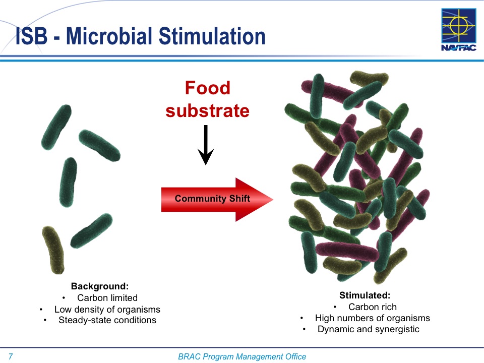 The Navy returned to these sites in July and, in this phase, they came to help natural bacteria finish up the job. Allowing bacteria to clean up petro chemicals through natural digestion is called bioremediation. To be effective and not take a century to eliminate the problem, the bulk of the chemicals need to first be reduced to concentrations that do not overwhelm the bacteria.