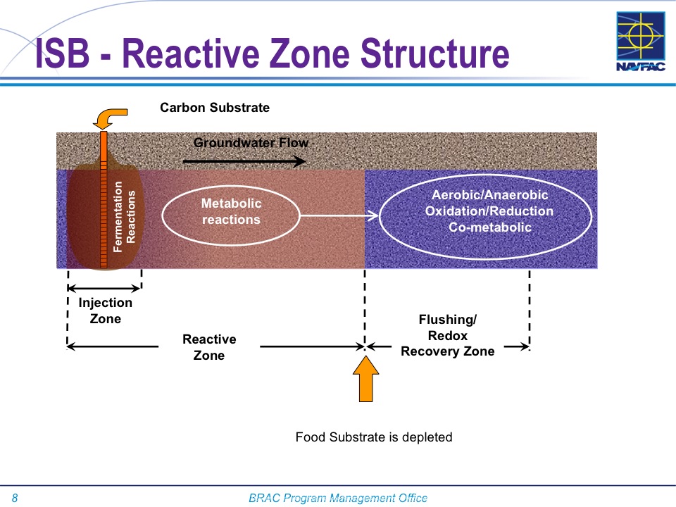 At both gas station sites the Navy used a special product designed to foster growth of natural bacteria in the ground, which includes a form of time-release peroxide that turns into oxygen over a period of 12 months. An oxygen environment is necessary for the bacteria to digest petroleum. The bacteria utilize the hydrocarbons (hydrogen and carbon) in the petroleum chemicals as part of their metabolic processes and convert them into carbon dioxide, water, and microbial cell mass. Water samples will be taken at three, six, and nine months after the July injections to evaluate effectiveness.