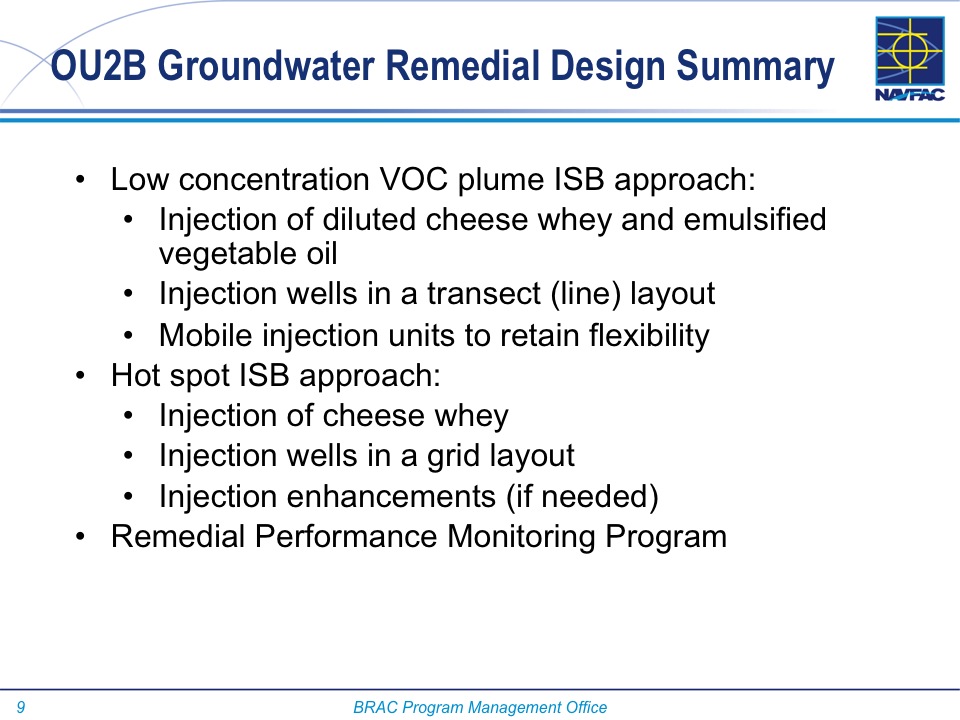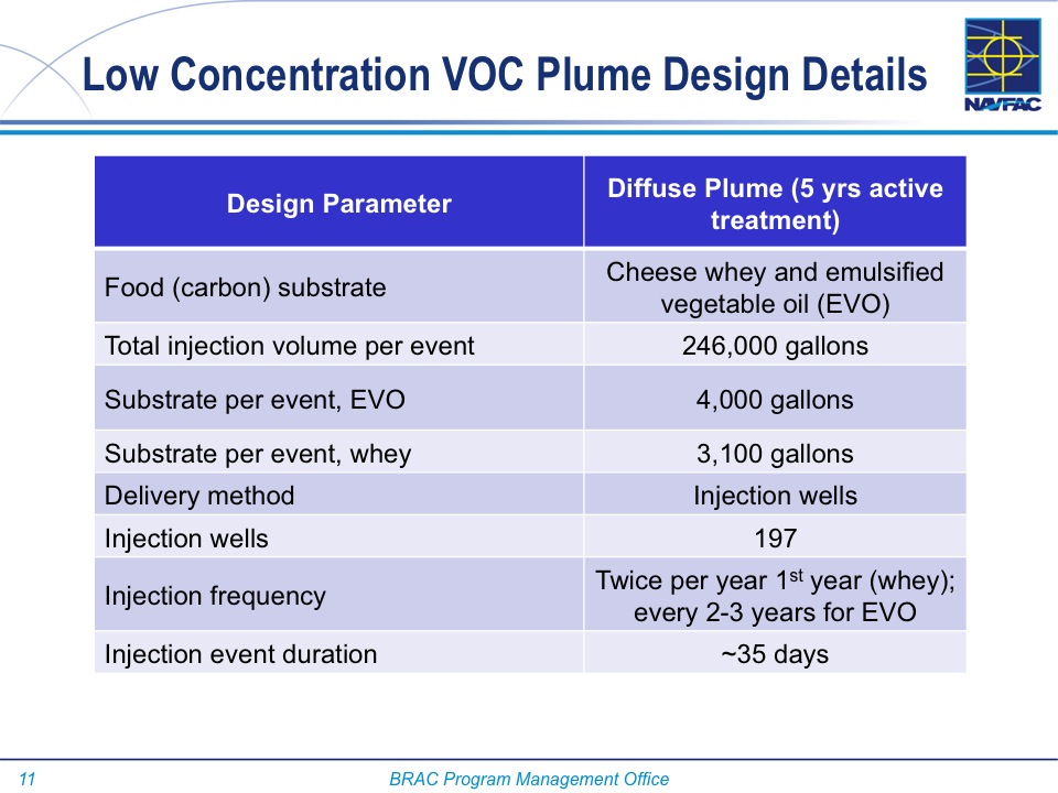 According to the Navy, this type of food-stimulated bacterial bioremediation is common. The cheese whey is similar to the powdered whey products found in grocery stores. It will be delivered to the site already diluted in water. A hose will be connected to a fire hydrant and hooked to a metering device that will mix the whey and oil solution with municipal water as it is pumped into the wellheads.