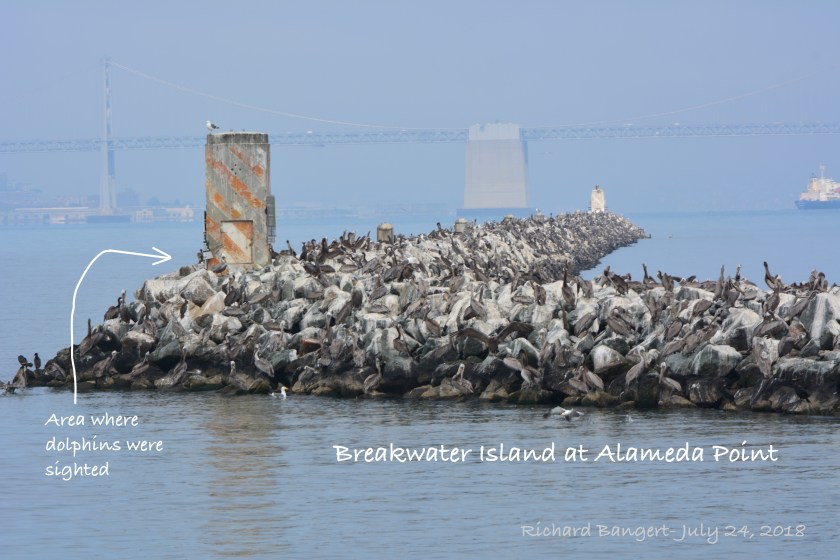 Bottlenose dolphins do not usually come to mind when thinking of wildlife at Alameda Point.  In fact, only three have been observed there in recent years, and those sightings were from canoes and kayaks.  But on July 24, two more dolphins were observed with two regulars meandering around next to Breakwater Island.  The standalone rock wall, or breakwater, is visible from Pier 3 where the USS Hornet Museum is berthed.