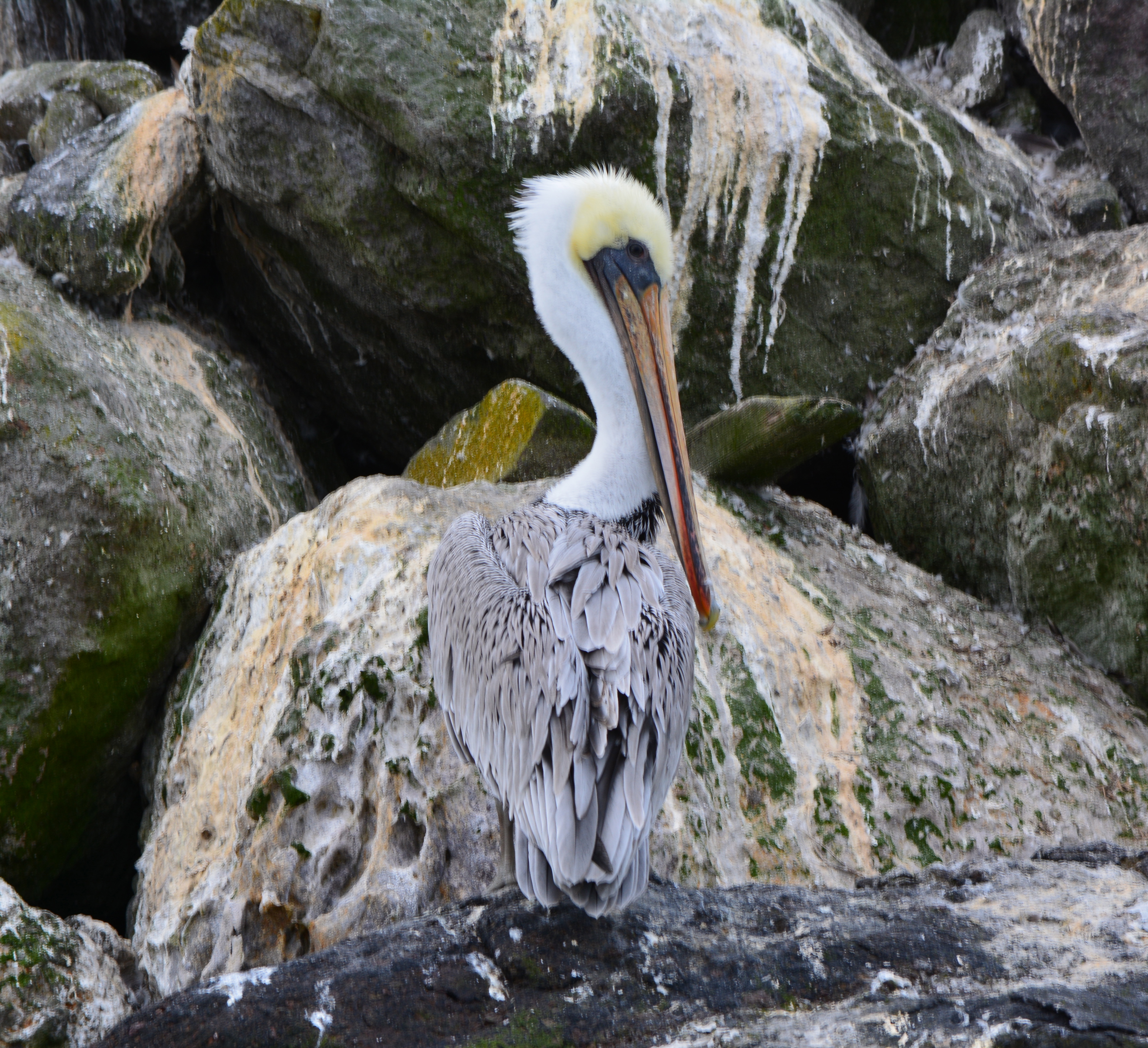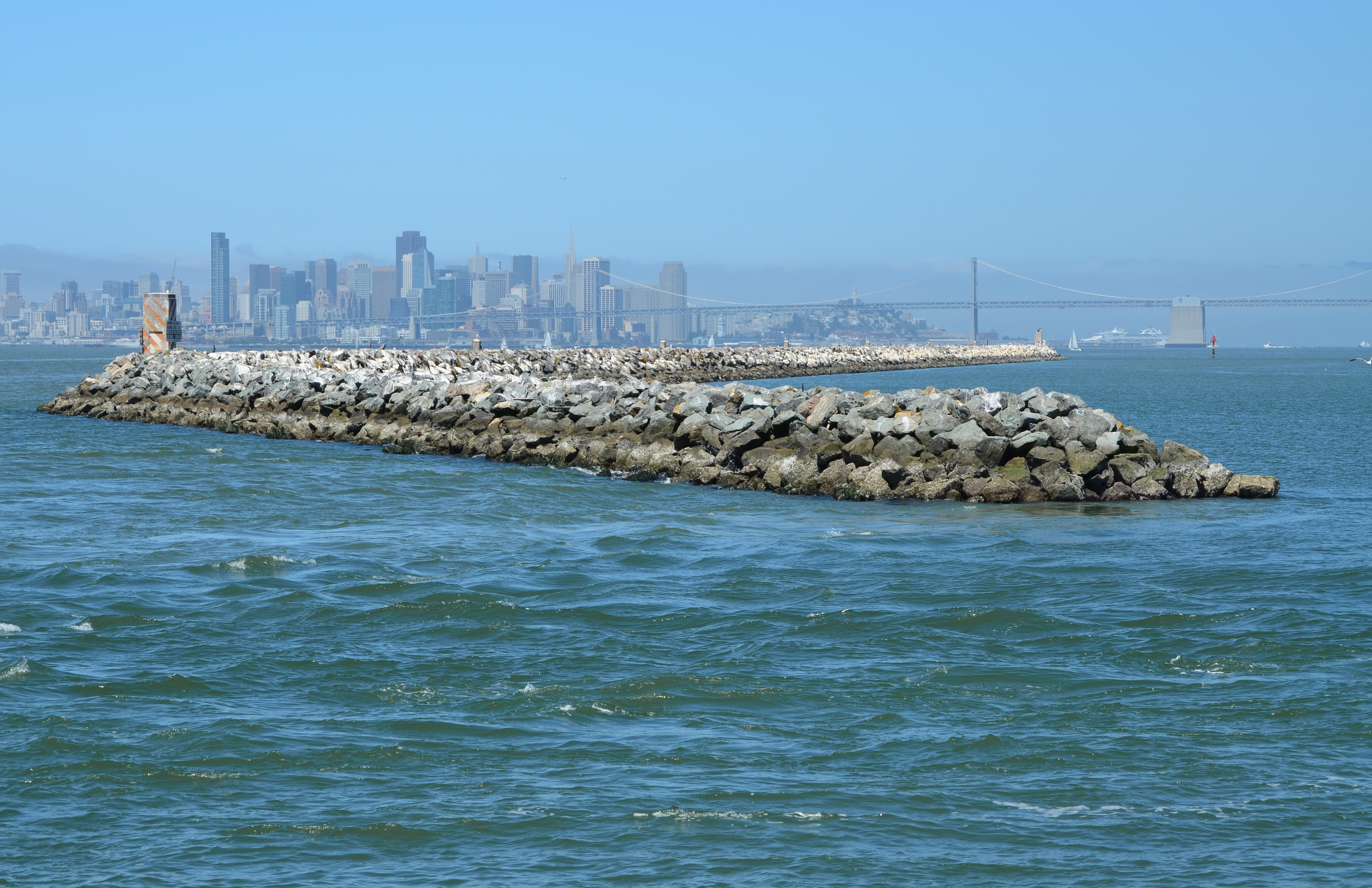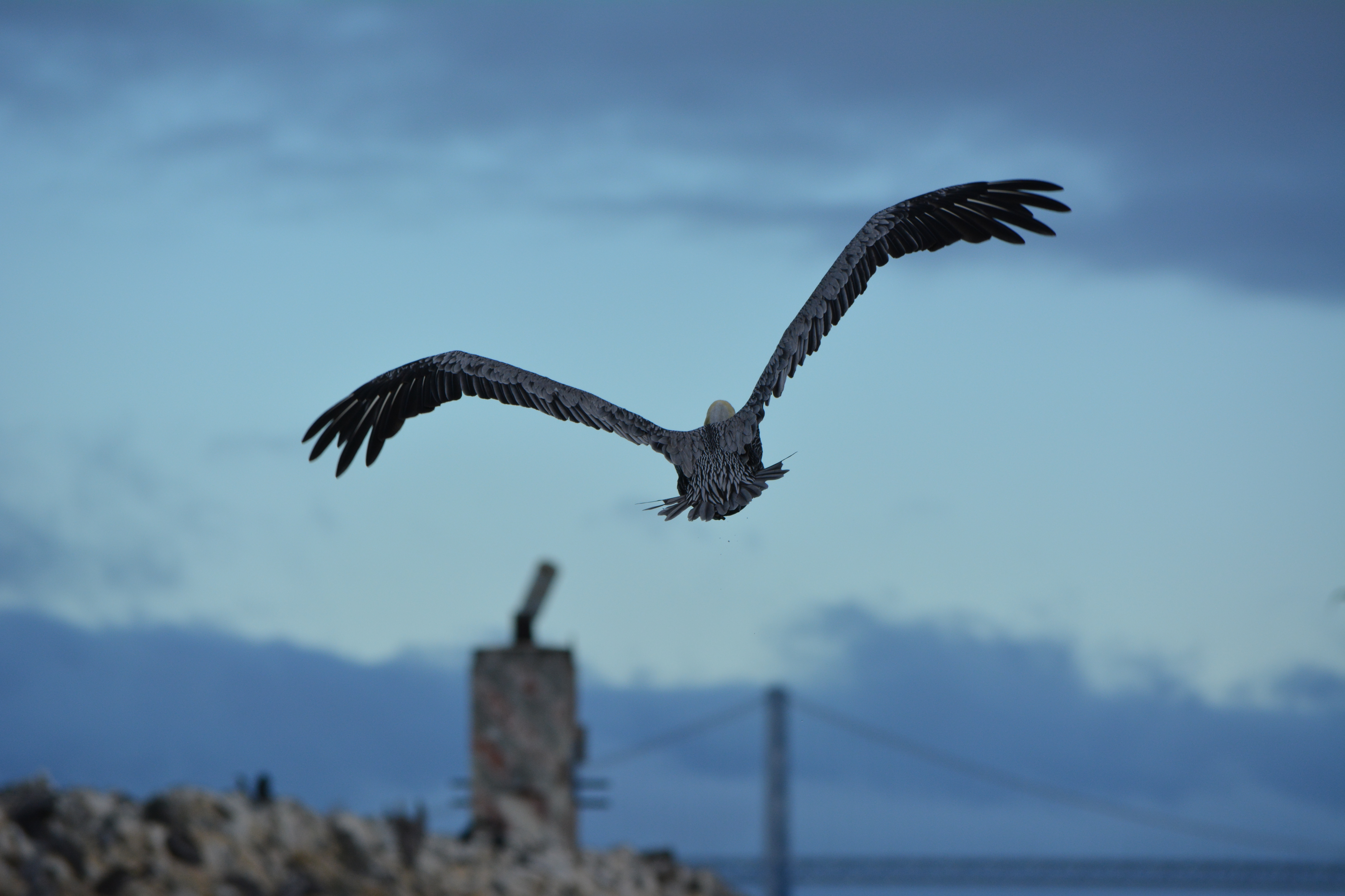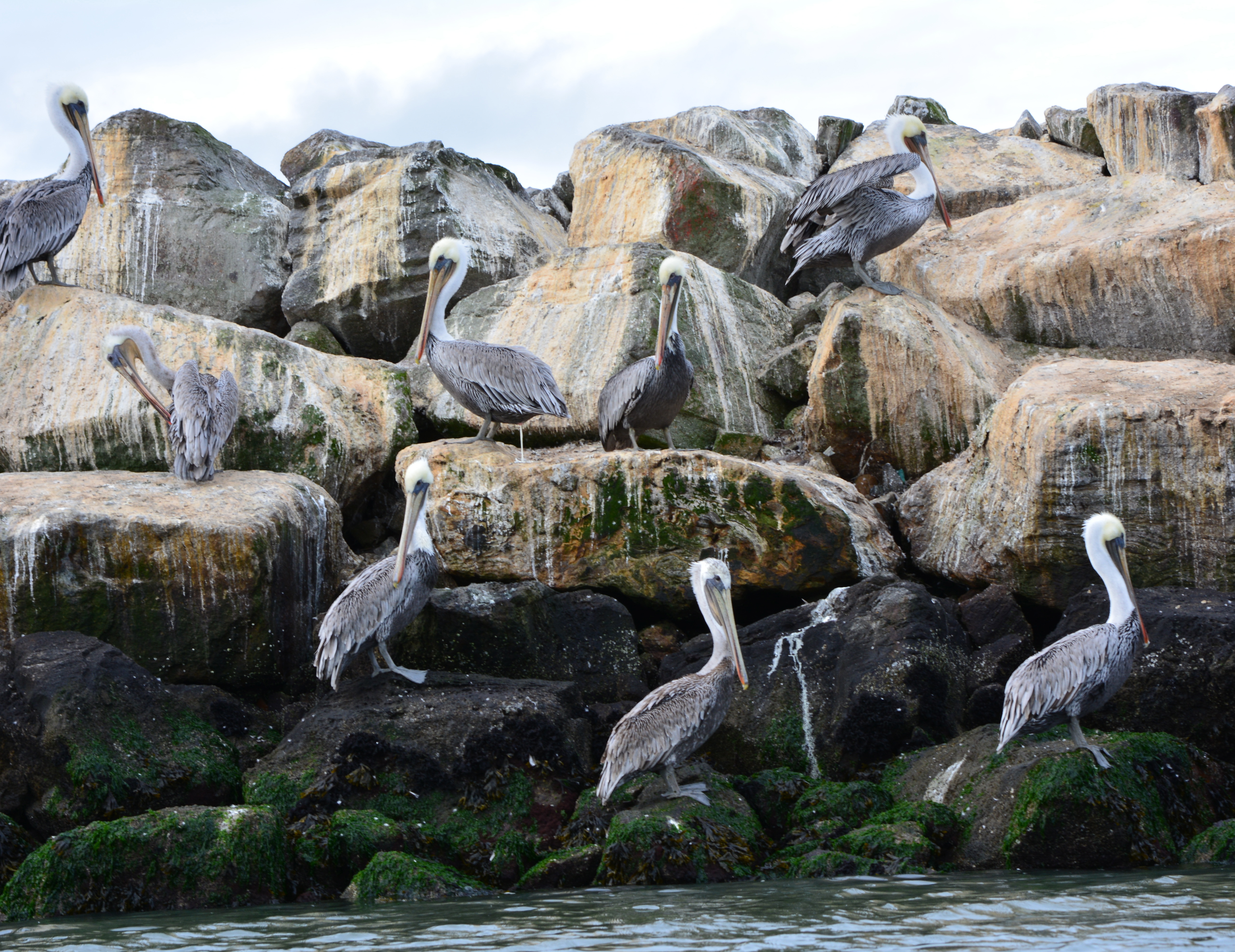 Every summer, thousands of California Brown Pelicans migrate north to the San Francisco Bay area from breeding sites on the Channel Islands and Mexico. As many as 8,000 have been counted on their favorite resting site in the Bay on the isolated breakwater barrier at Alameda Point, known as Breakwater Island or the outer rock wall.