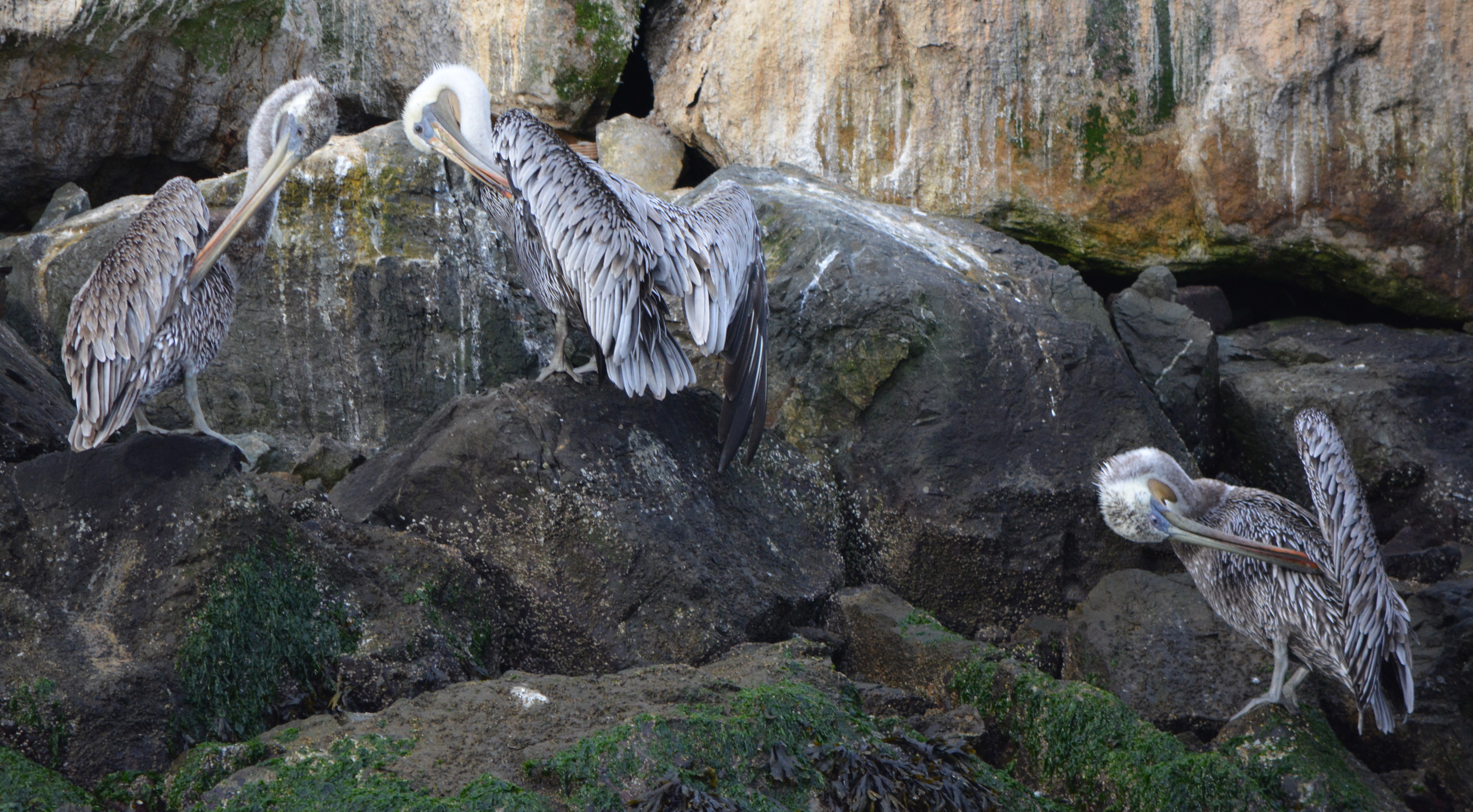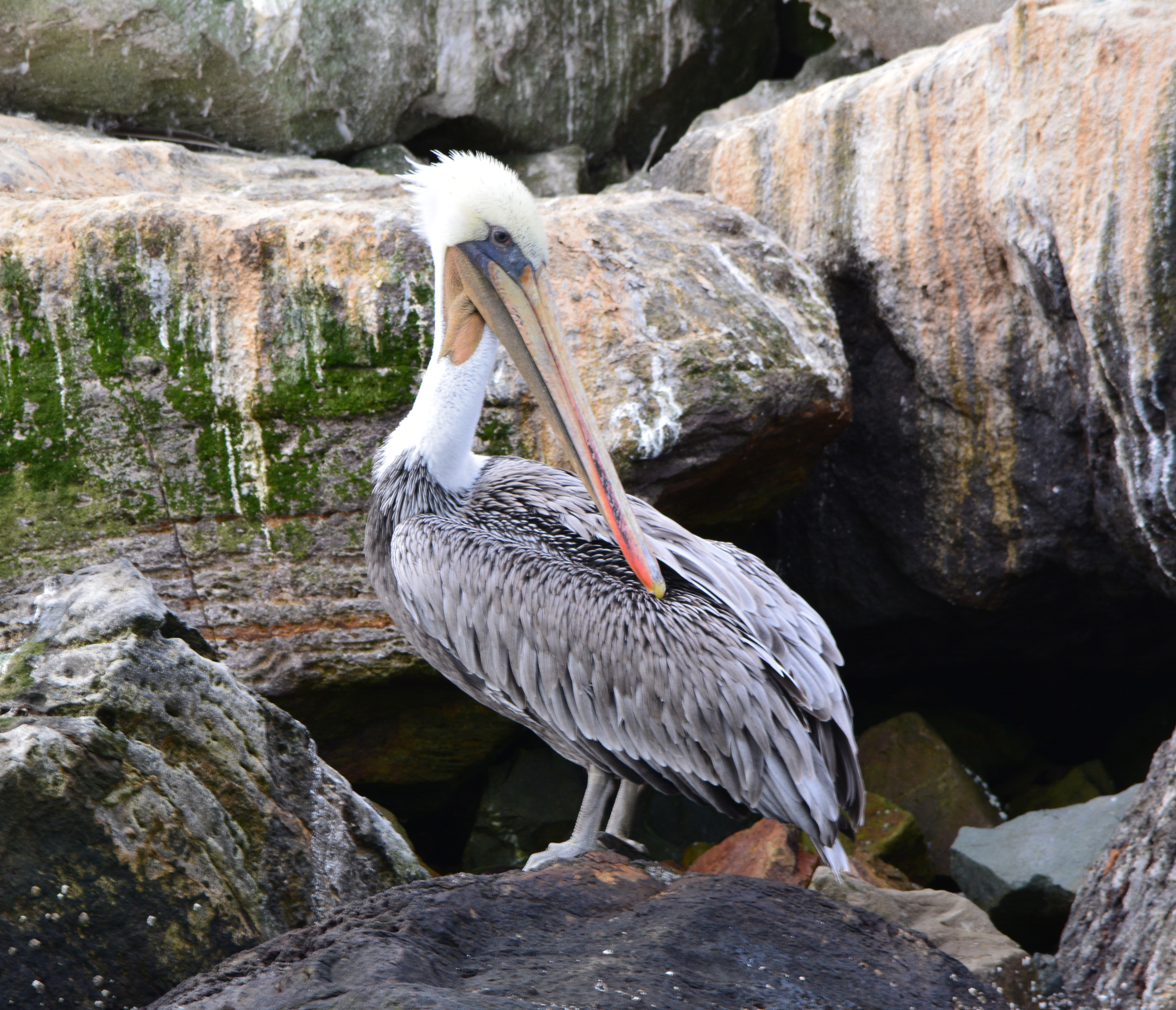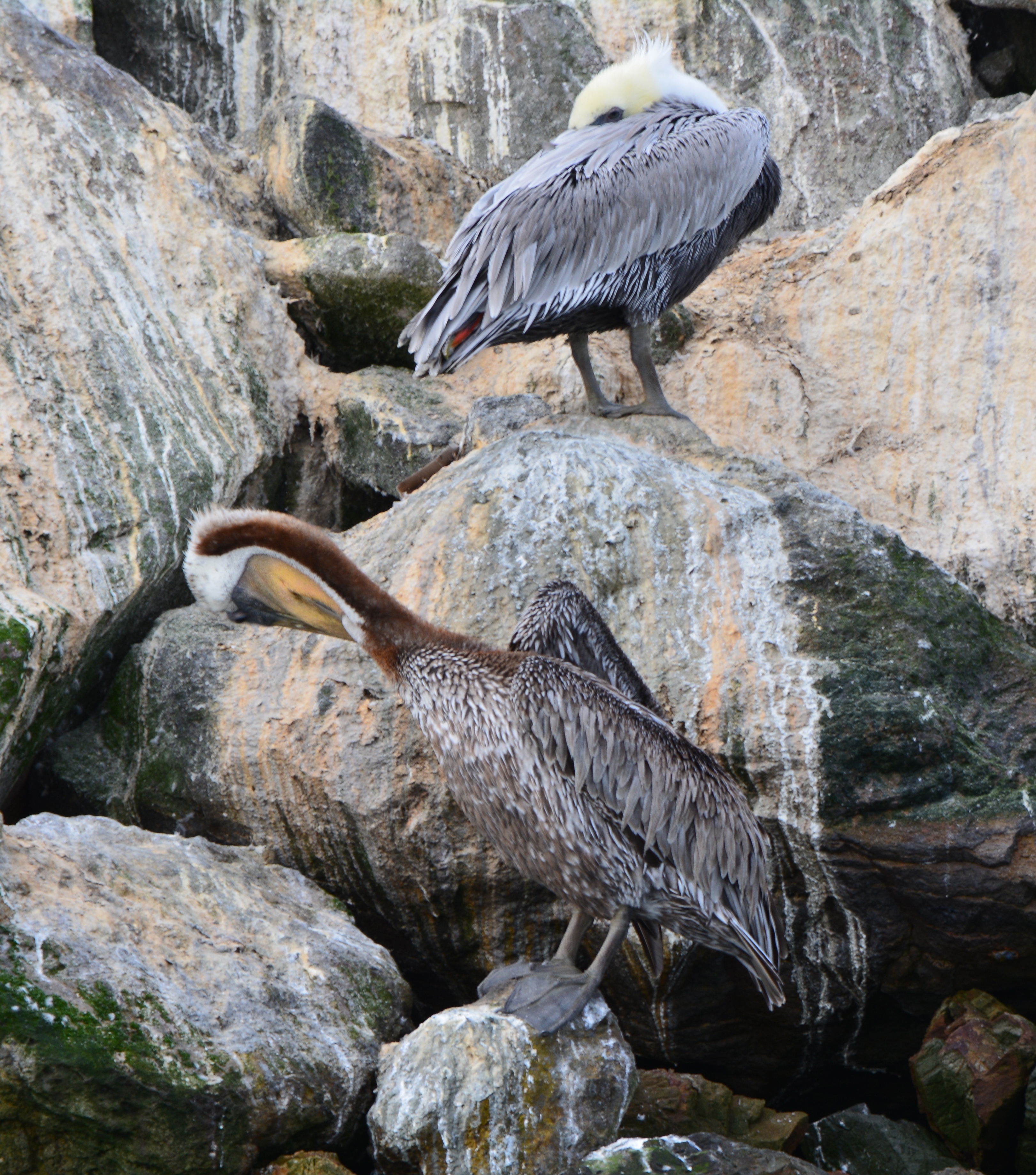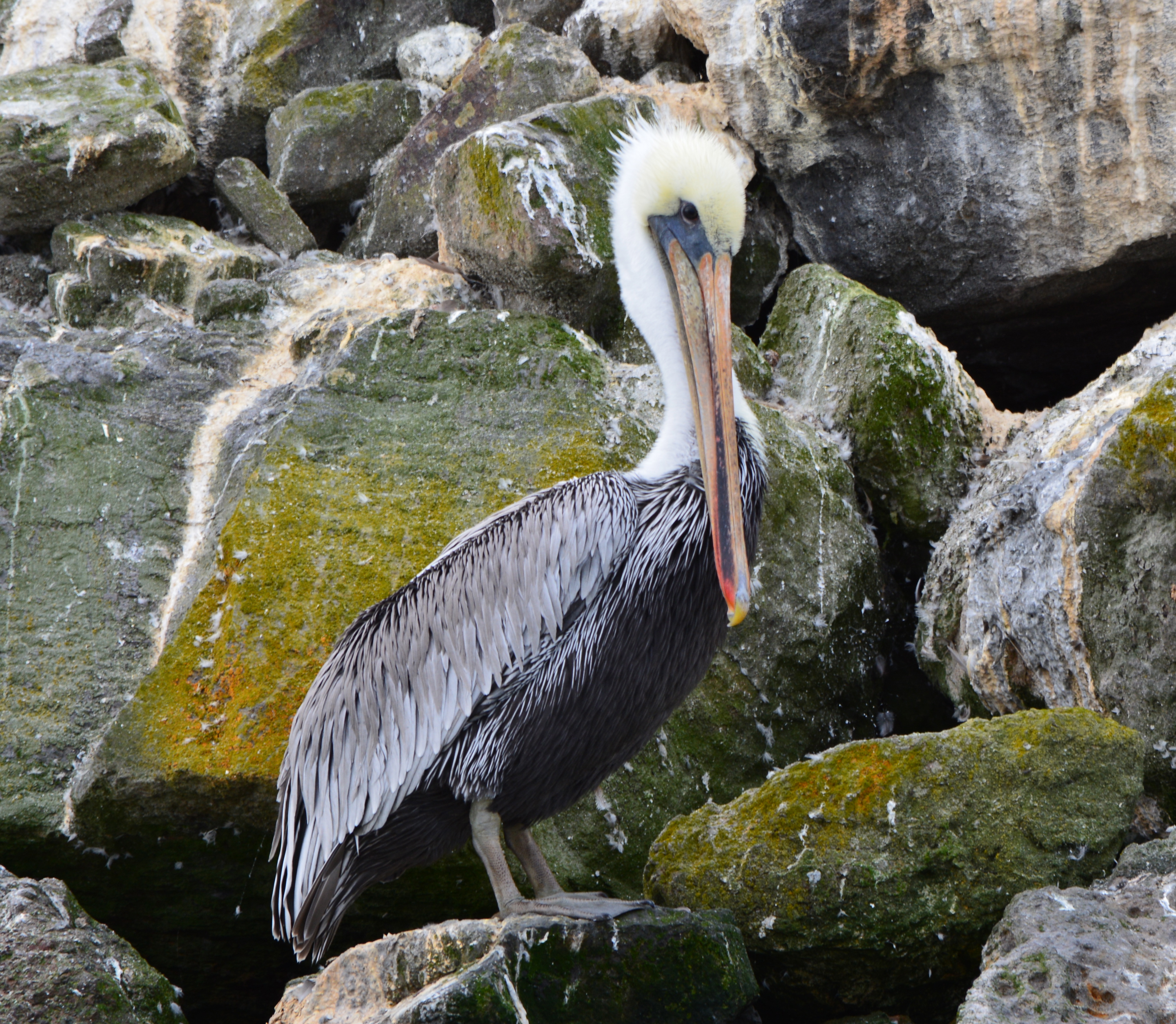 Every summer, thousands of California Brown Pelicans migrate north to the San Francisco Bay area from breeding sites on the Channel Islands and Mexico. As many as 8,000 have been counted on their favorite resting site in the Bay on the isolated breakwater barrier at Alameda Point, known as Breakwater Island or the outer rock wall.