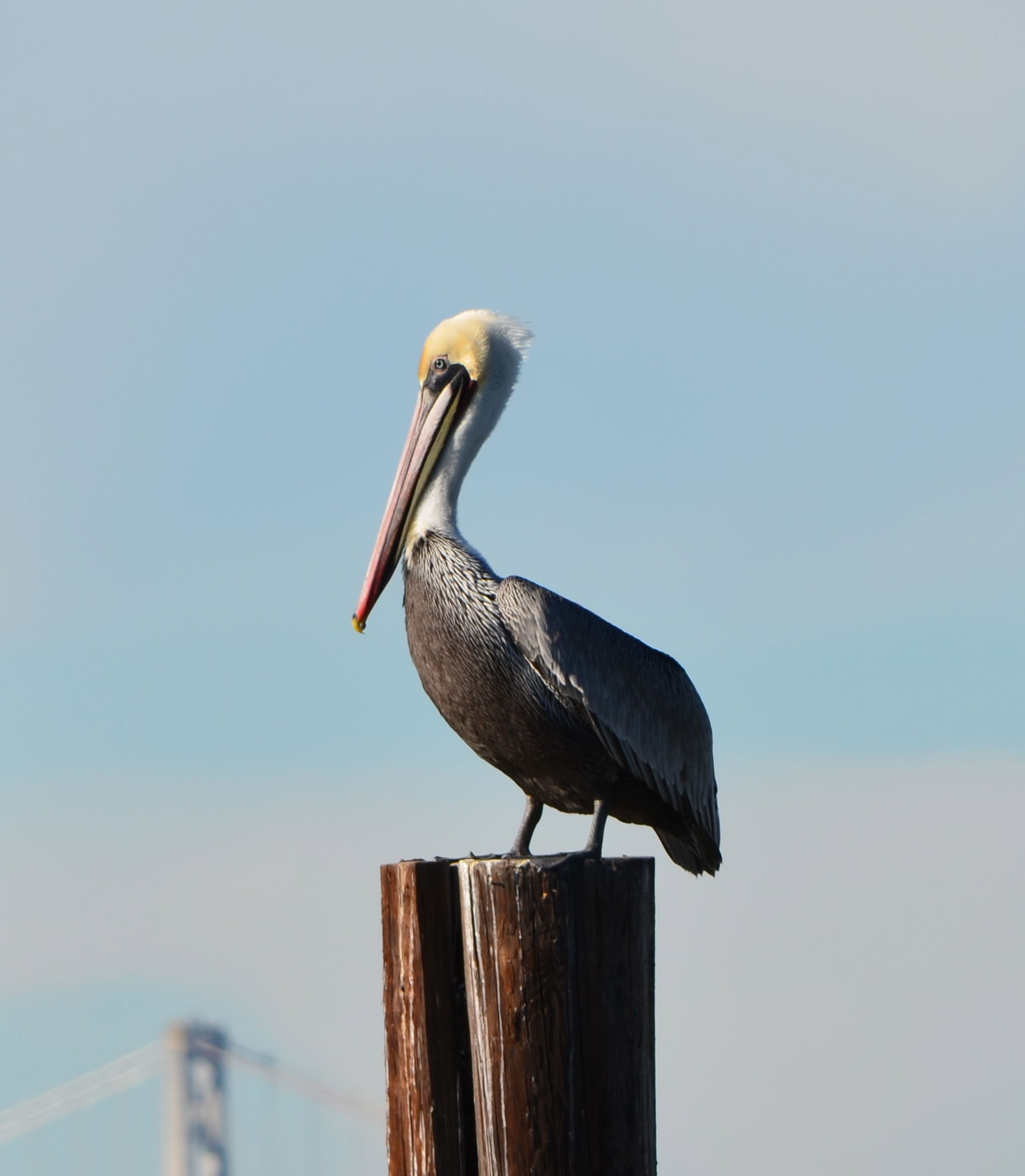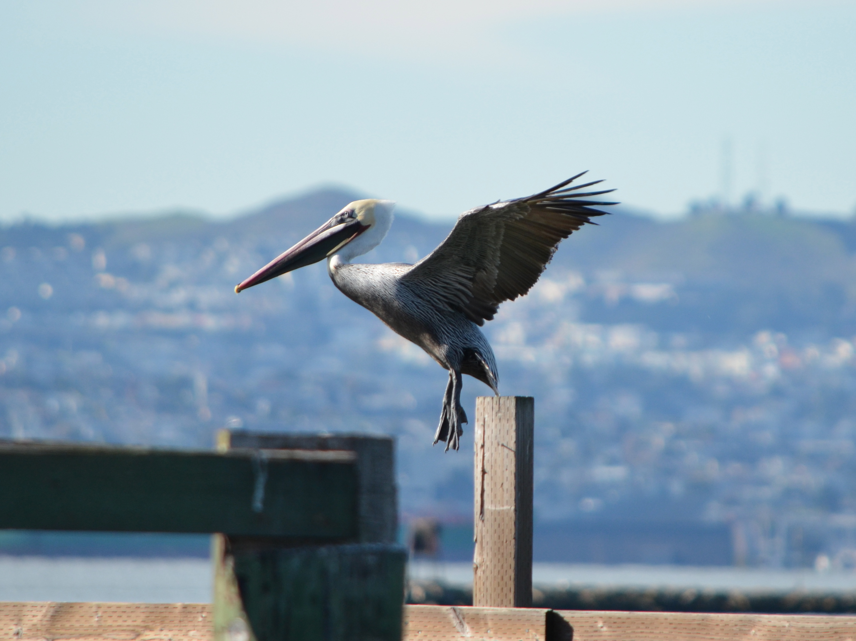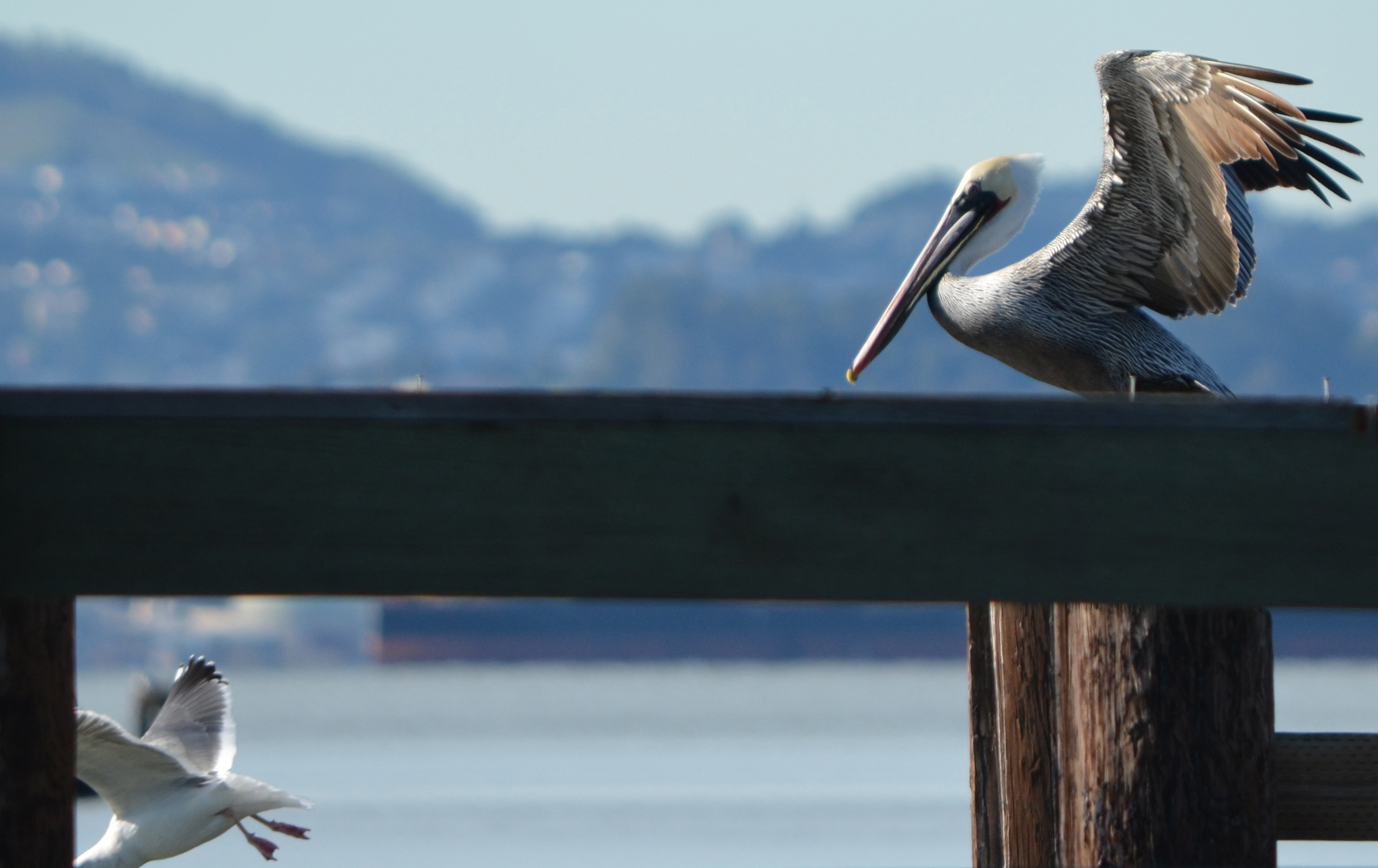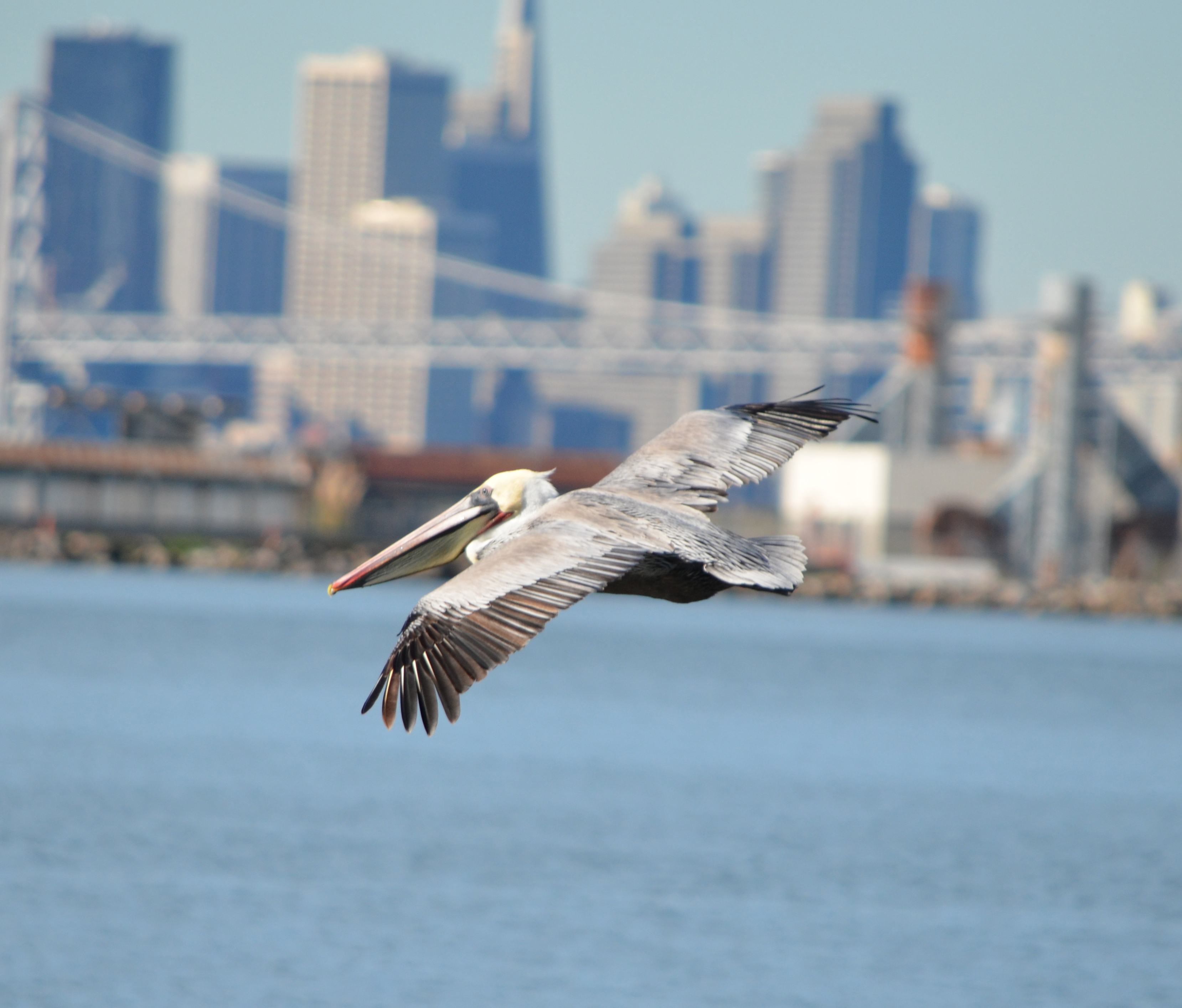 In the summer and fall, the brown pelicans can range from nesting colonies in Mexico and the Channel Islands all the way up to British Columbia. Alameda Point’s Breakwater Island is the largest roosting site in San Francisco Bay. A safe, secure roosting area is essential for pelicans to rest, preen, dry their feathers, maintain body temperature, and socialize.
