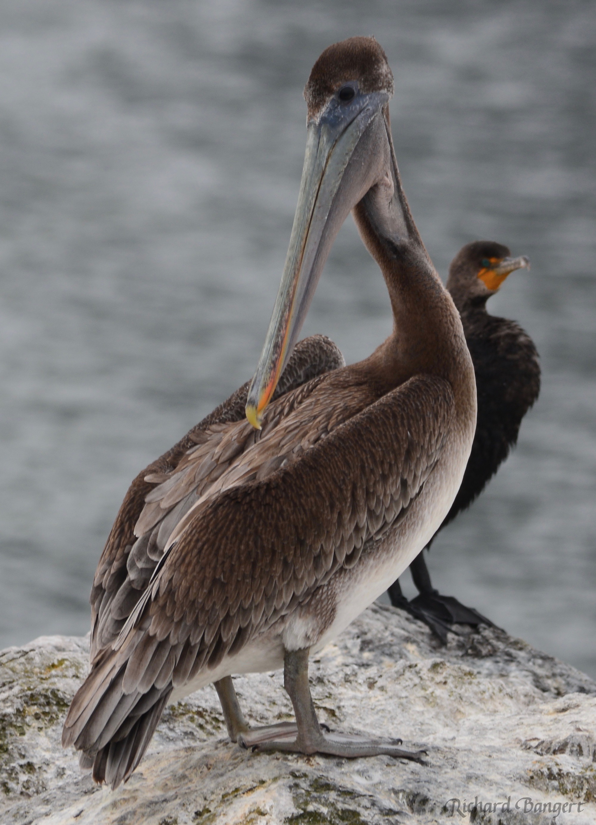 Immature (1 or 2 years old) Brown Pelican with all-brown head and neck, the only one spotted among about 100 pelicans on the dock on December 23, 2015.