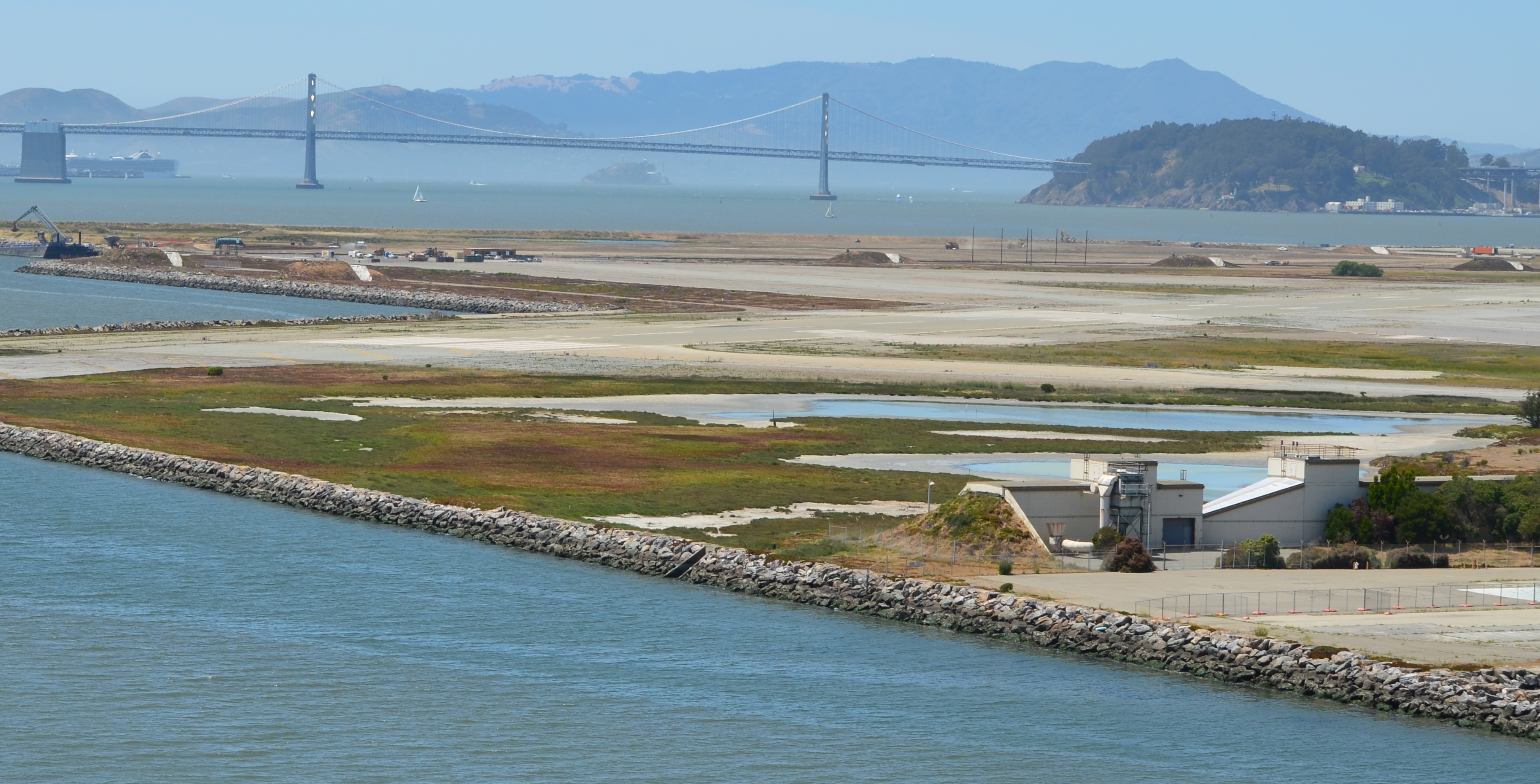 Alameda Point Runway Wetland in foreground, suitable for wetland enhancement as mitigation for wetland loss on VA developed area.
