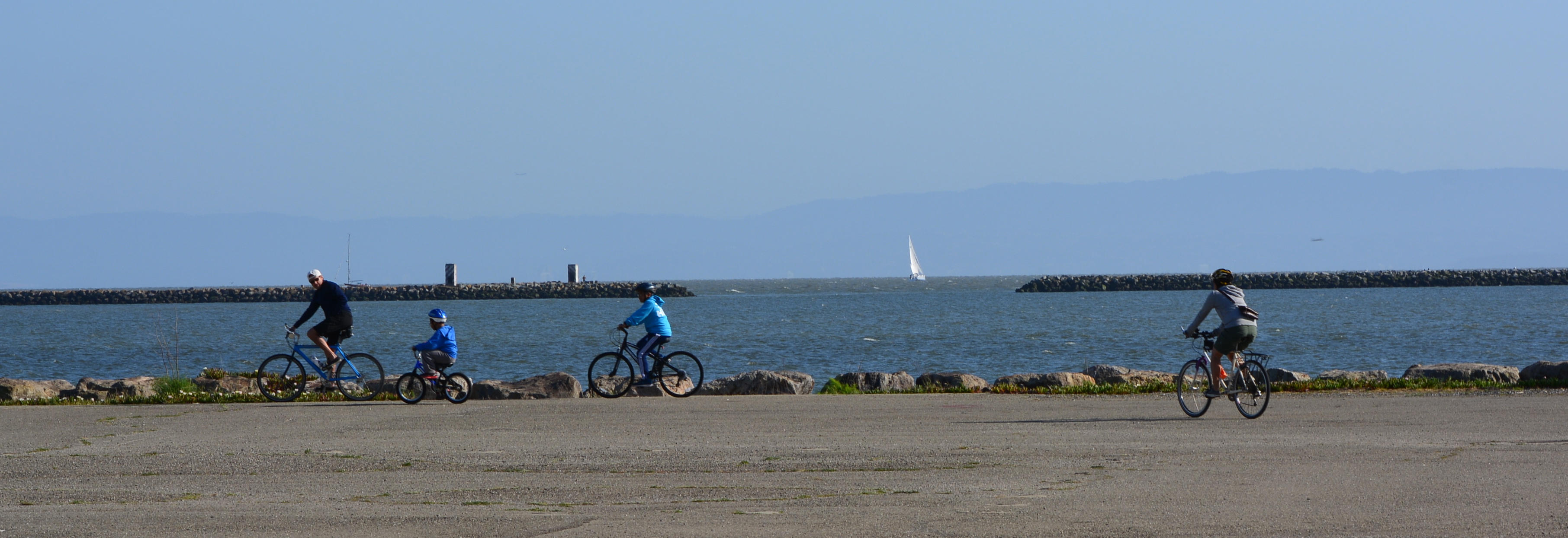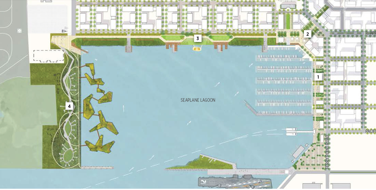Waterfront plan showing proposed natural park on west side (left) of Seaplane Lagoon.The distance to walk to the Bay shoreline from the gate, at the west side of Seaplane Lagoon, looking south.Family bicycling to the shoreline on west side of Seaplane Lagoon.