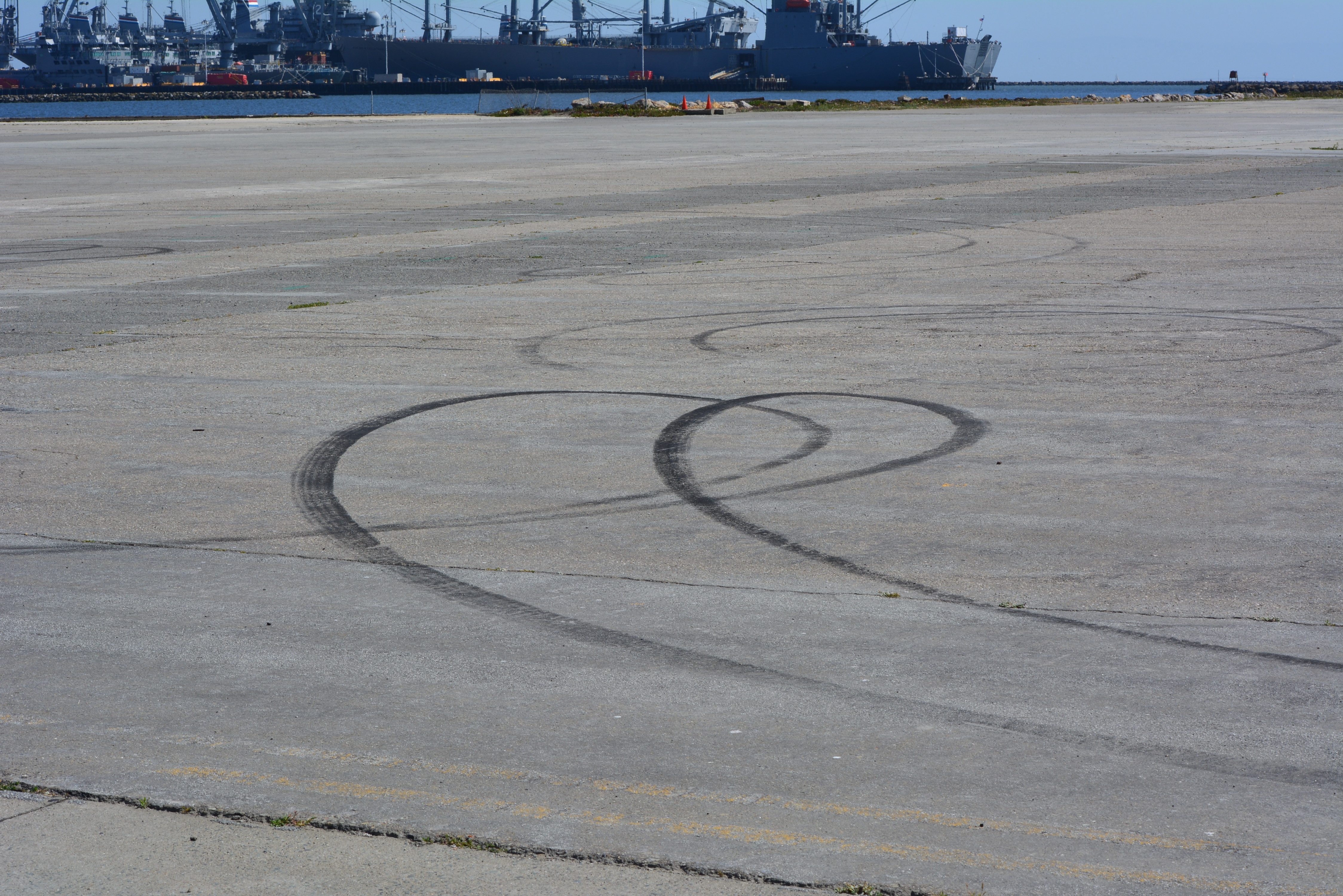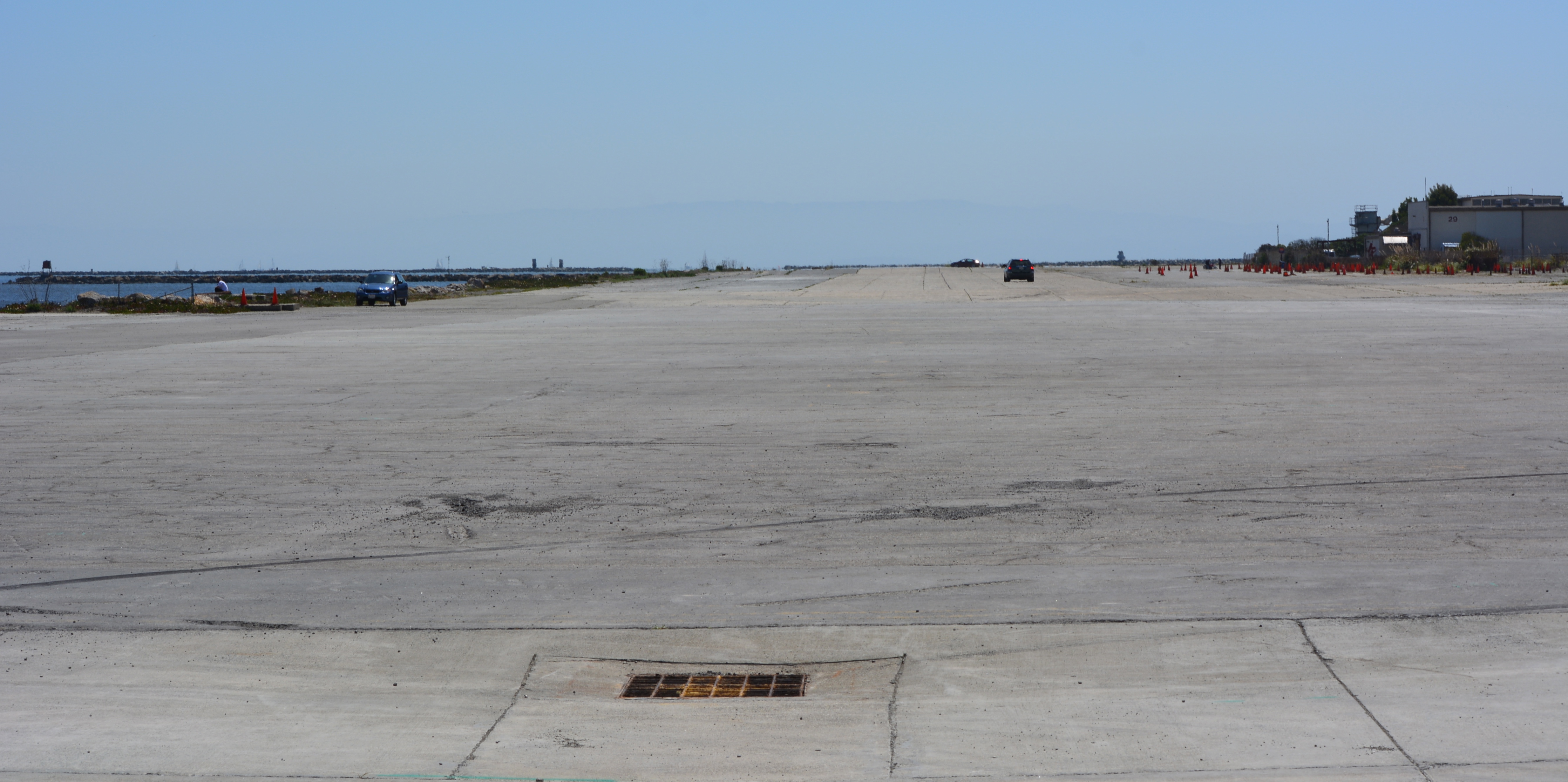 An investigation of the tarmac area revealed a few tire tracks, but otherwise it was clean. Similar displays of tire tracks from “side show” activities appear prominently throughout Alameda Point. Illegal dumping has been a problem at the former Naval Air Station since its closure, concentrated mainly in abandoned housing areas, not on the tarmac.