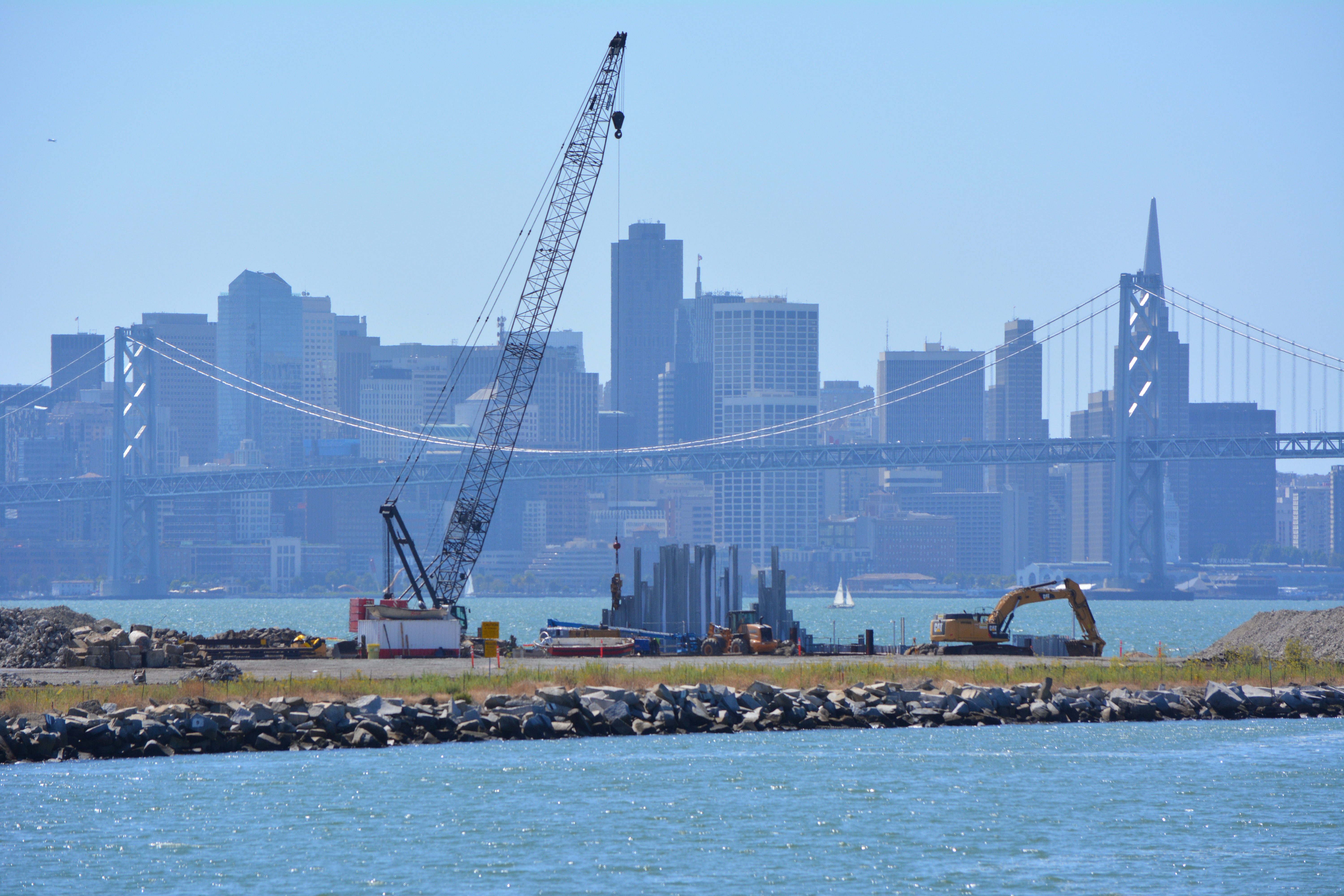 Part of the shoreline along the Oakland Estuary at Alameda Point has been upgraded with a prominent new pale gray stone embankment. While the aesthetic value is immediately apparent, the engineering value is not.