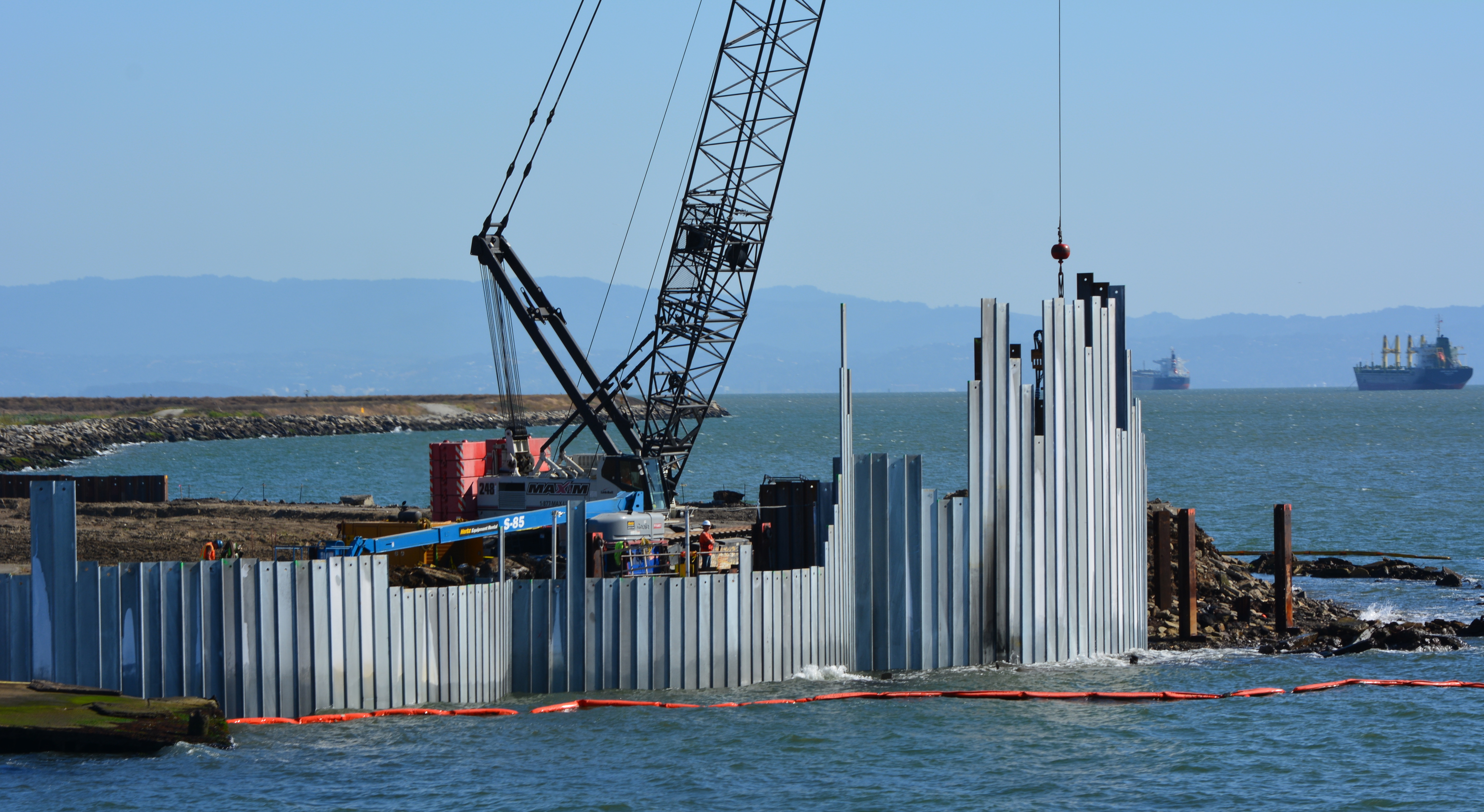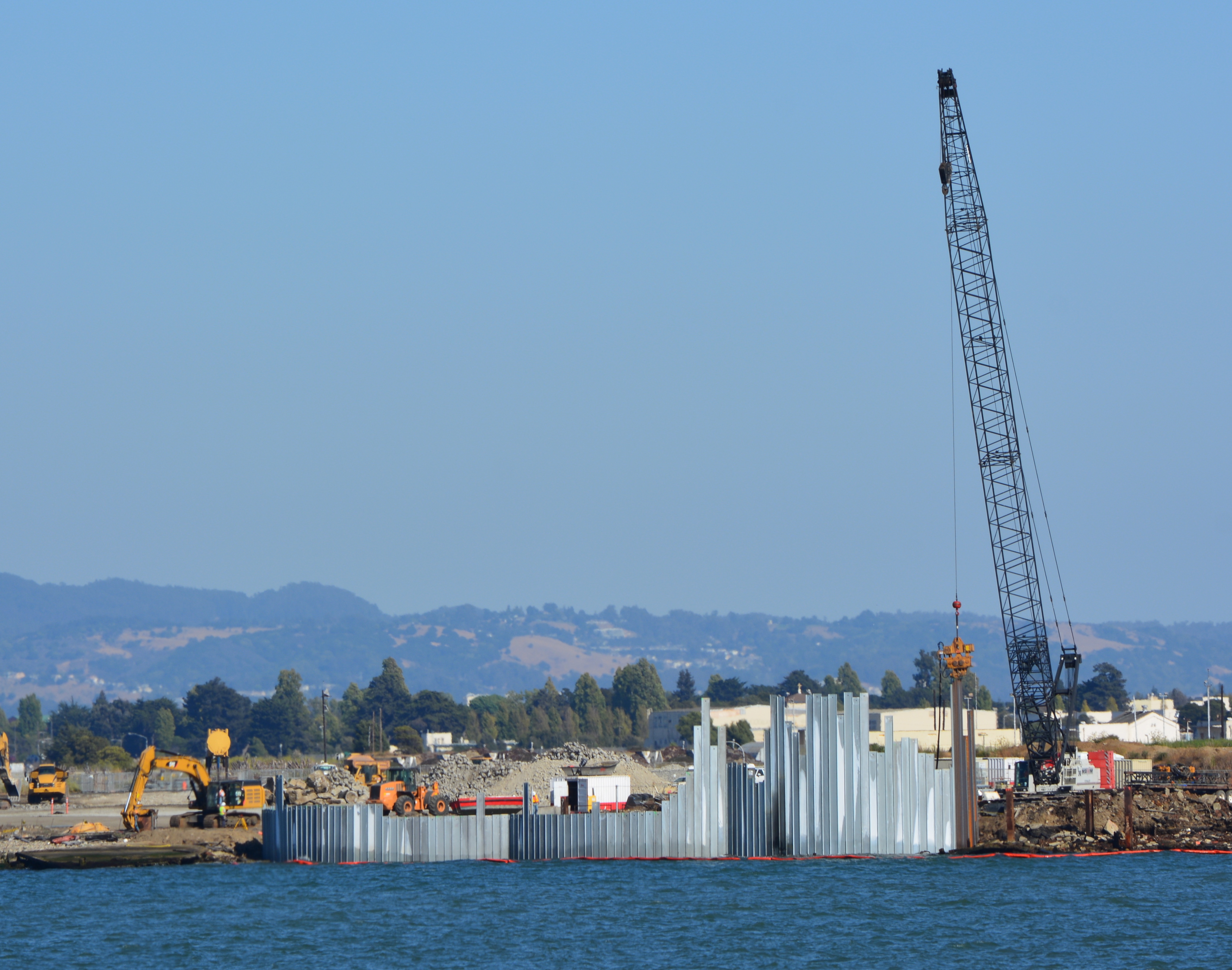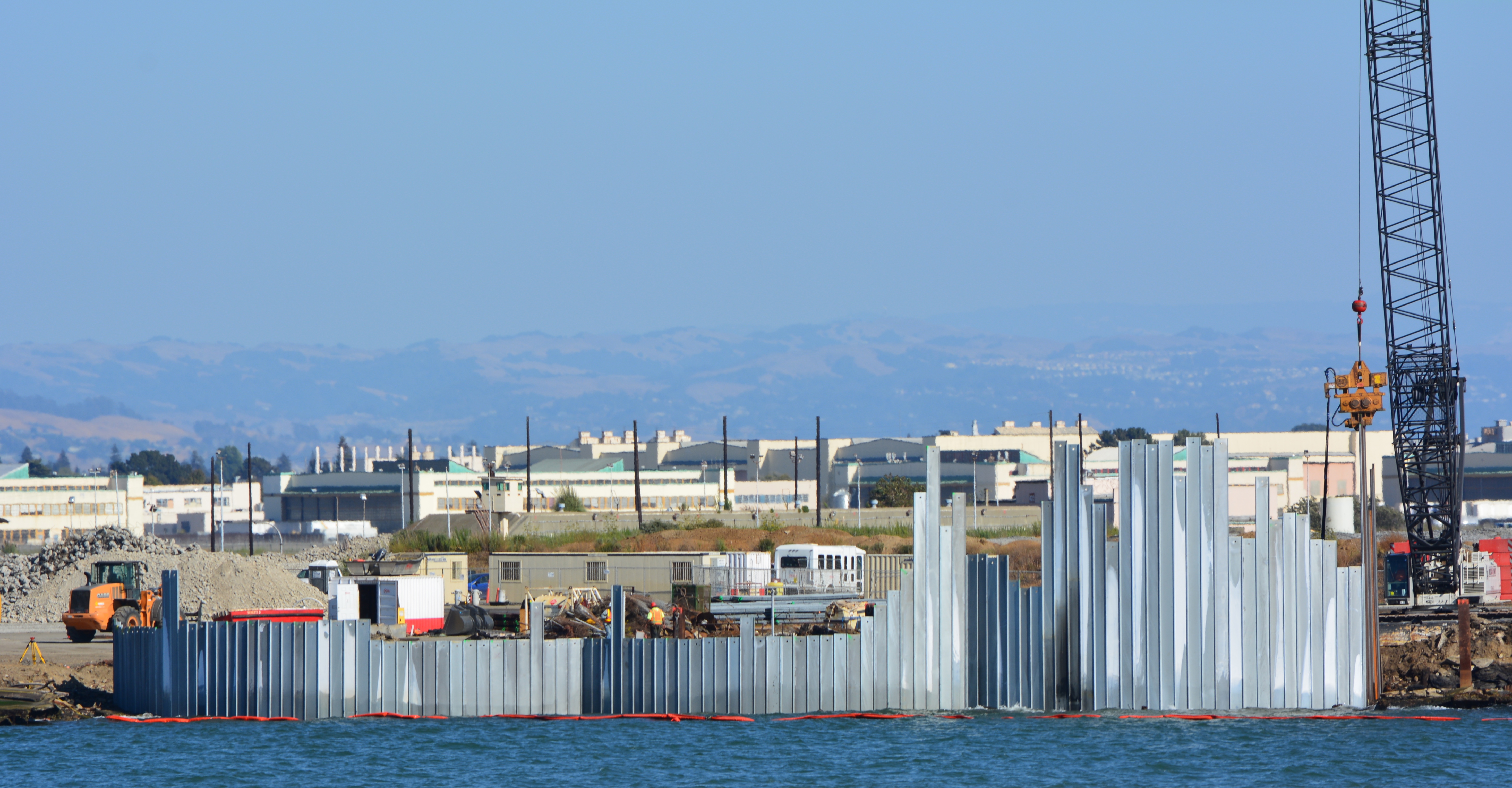Shoreline contamination barrier under construction at NW tip of Alameda Point