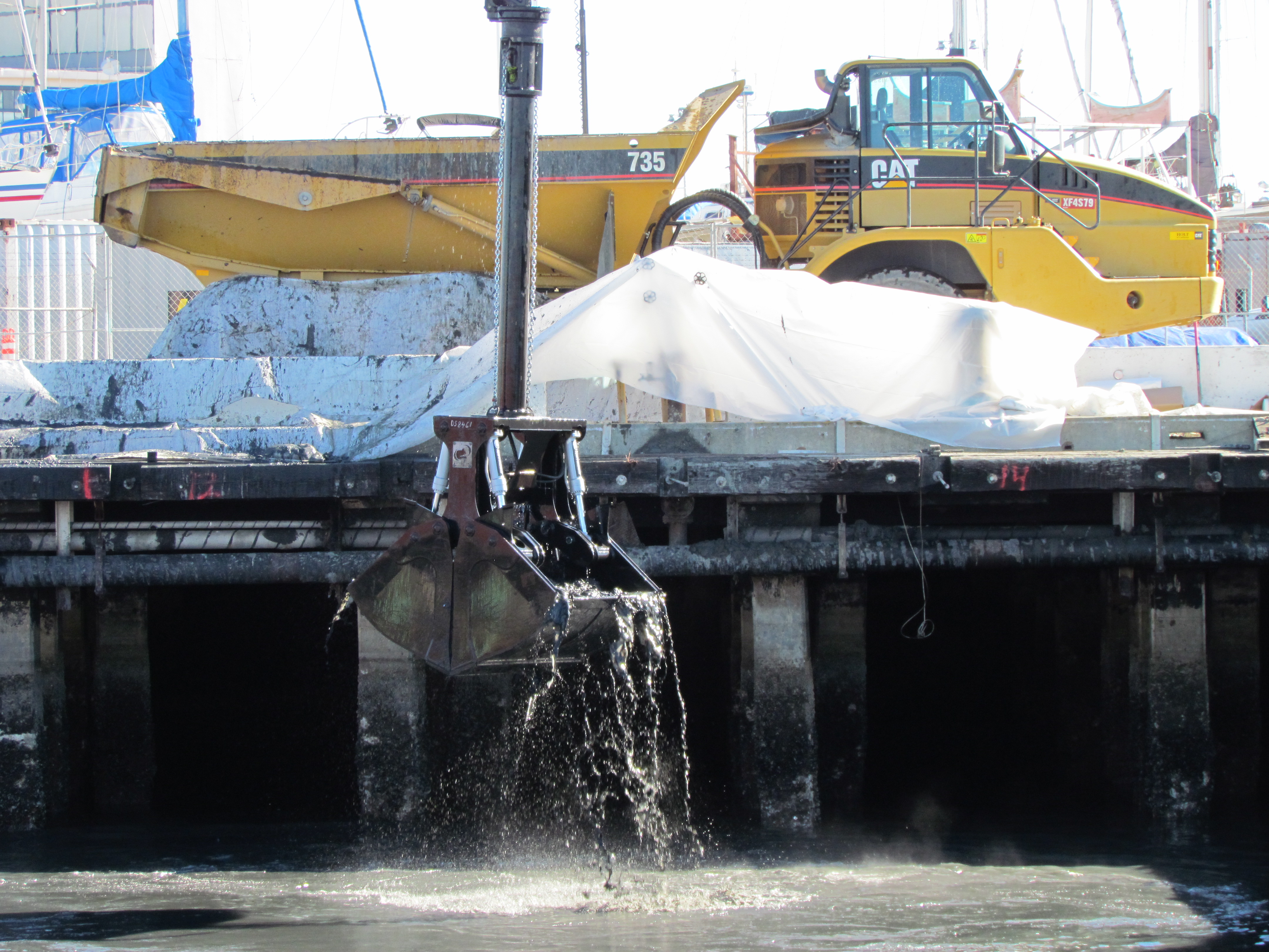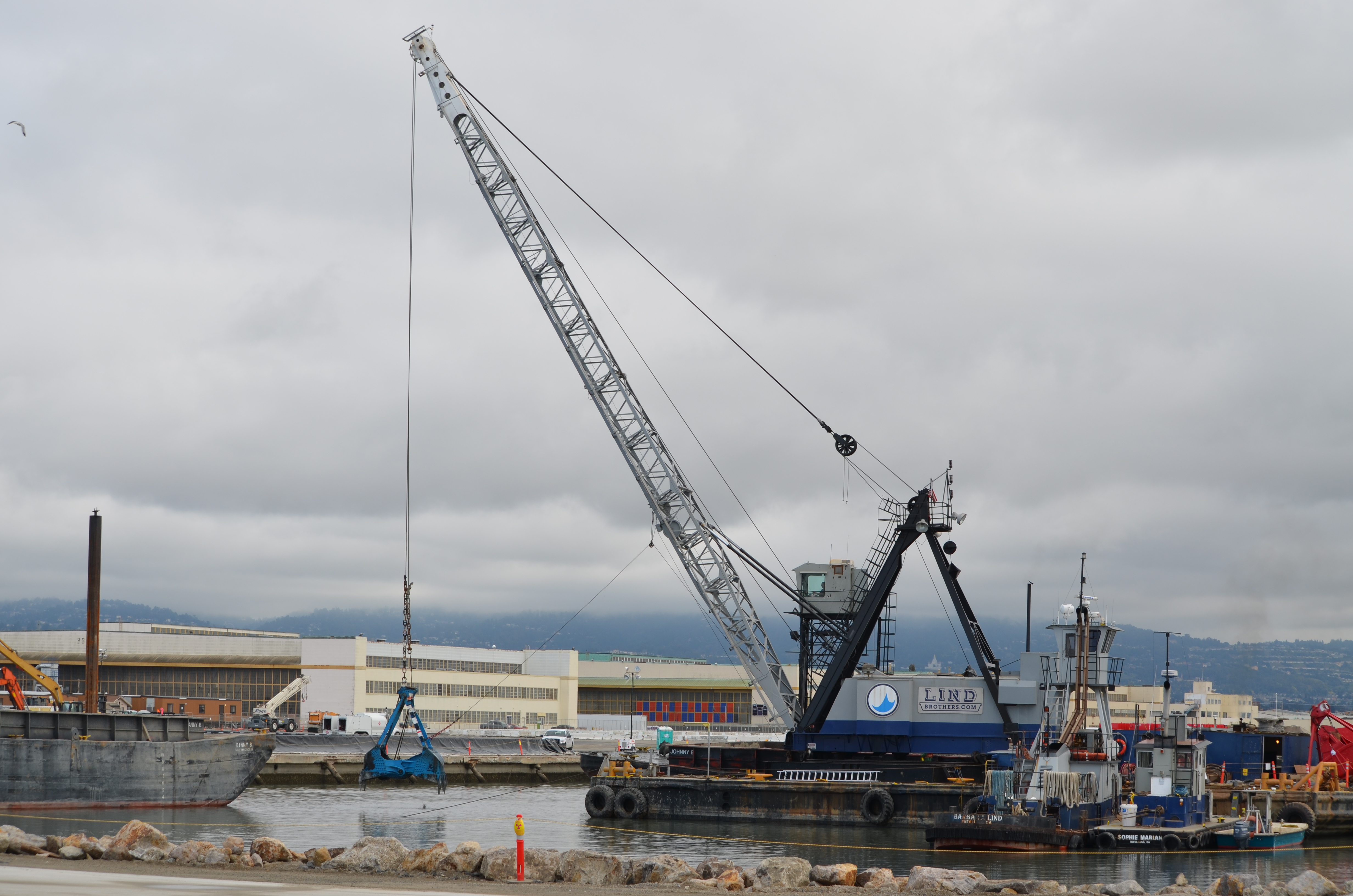 Soil from Decker Island being off loaded from barge at southwest corner of Alameda Point.