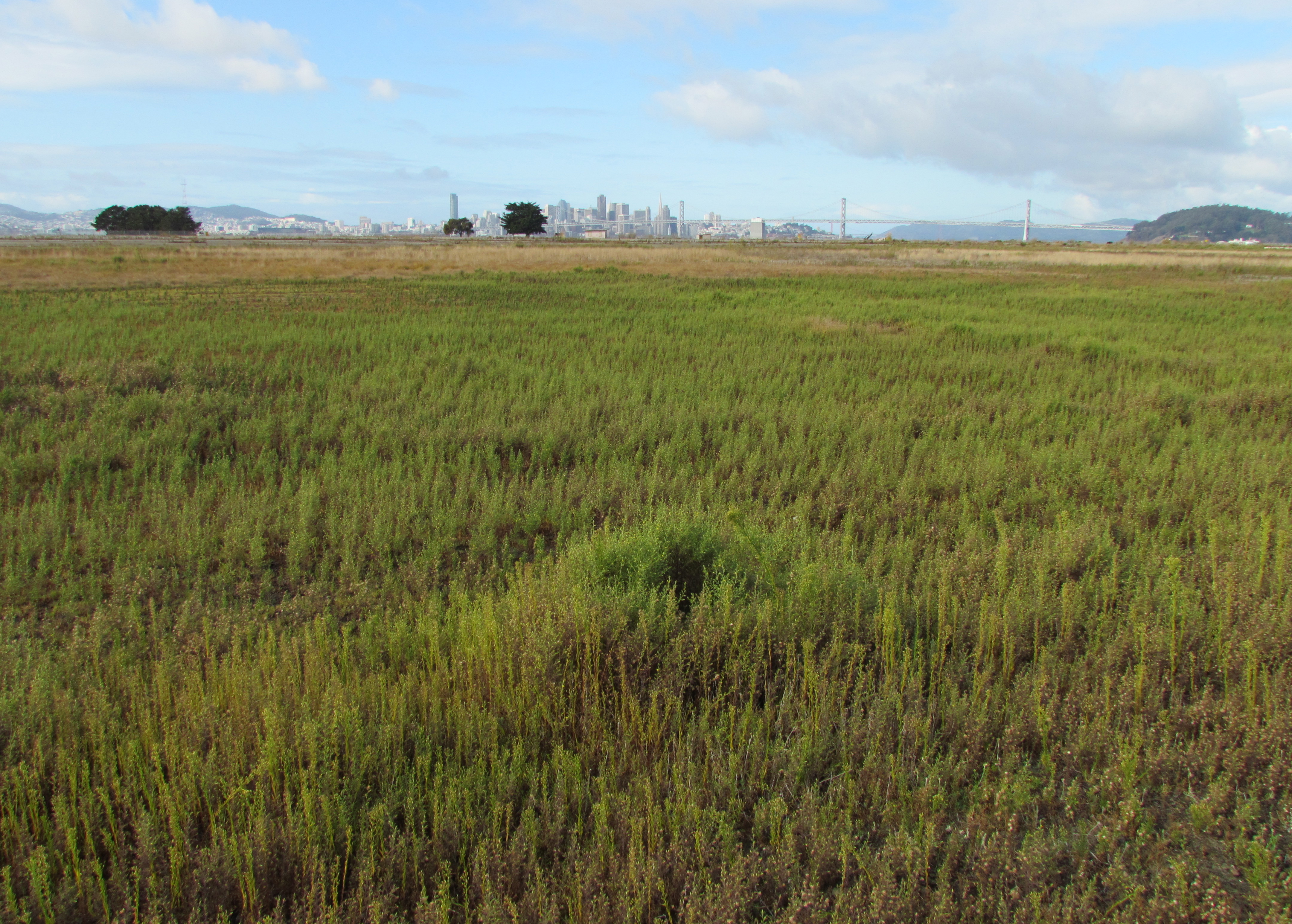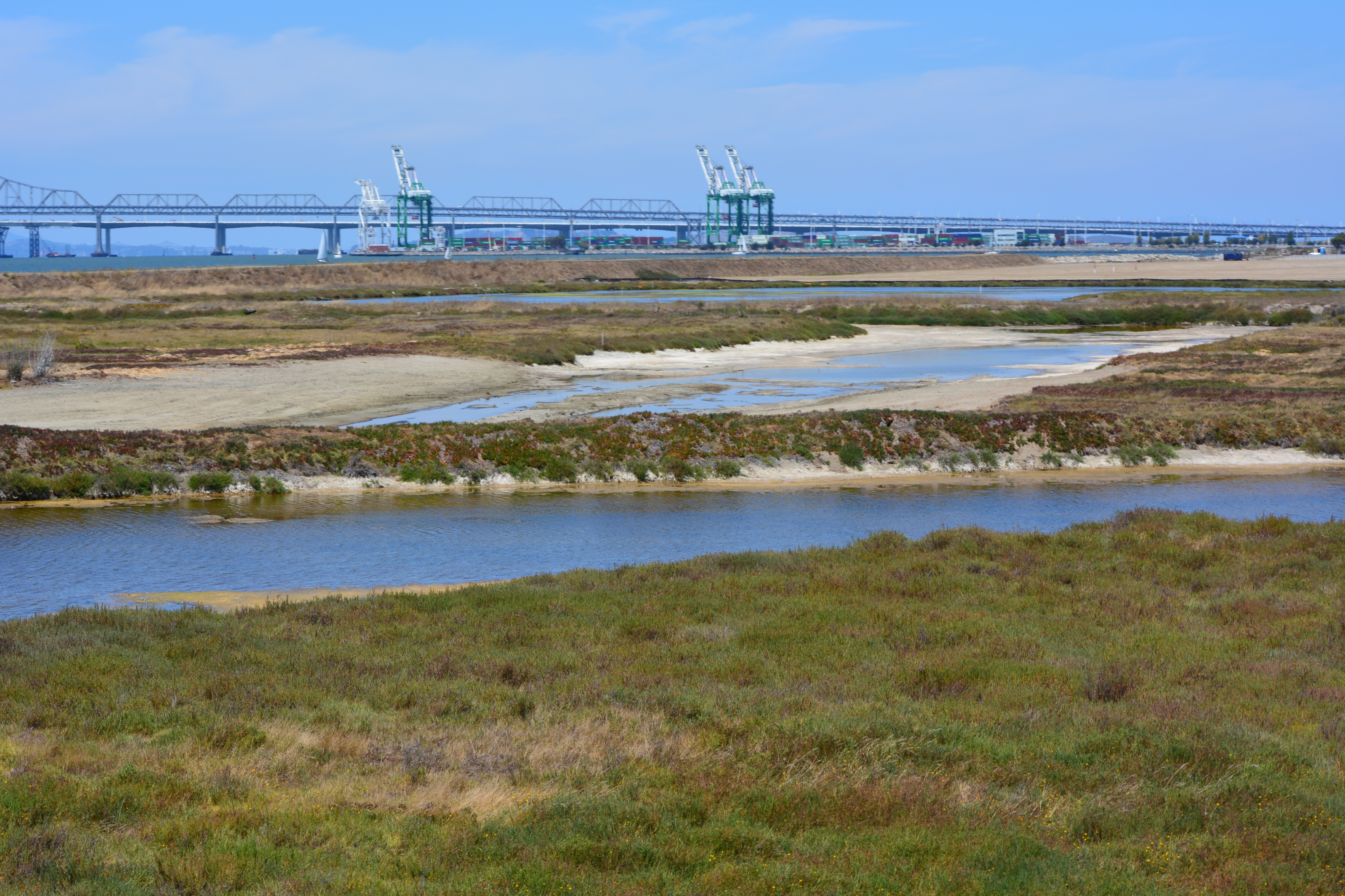 West Beach Wetland with San Francisco Bay in the background. Part of wetland is connected to the Bay via metal culvert.