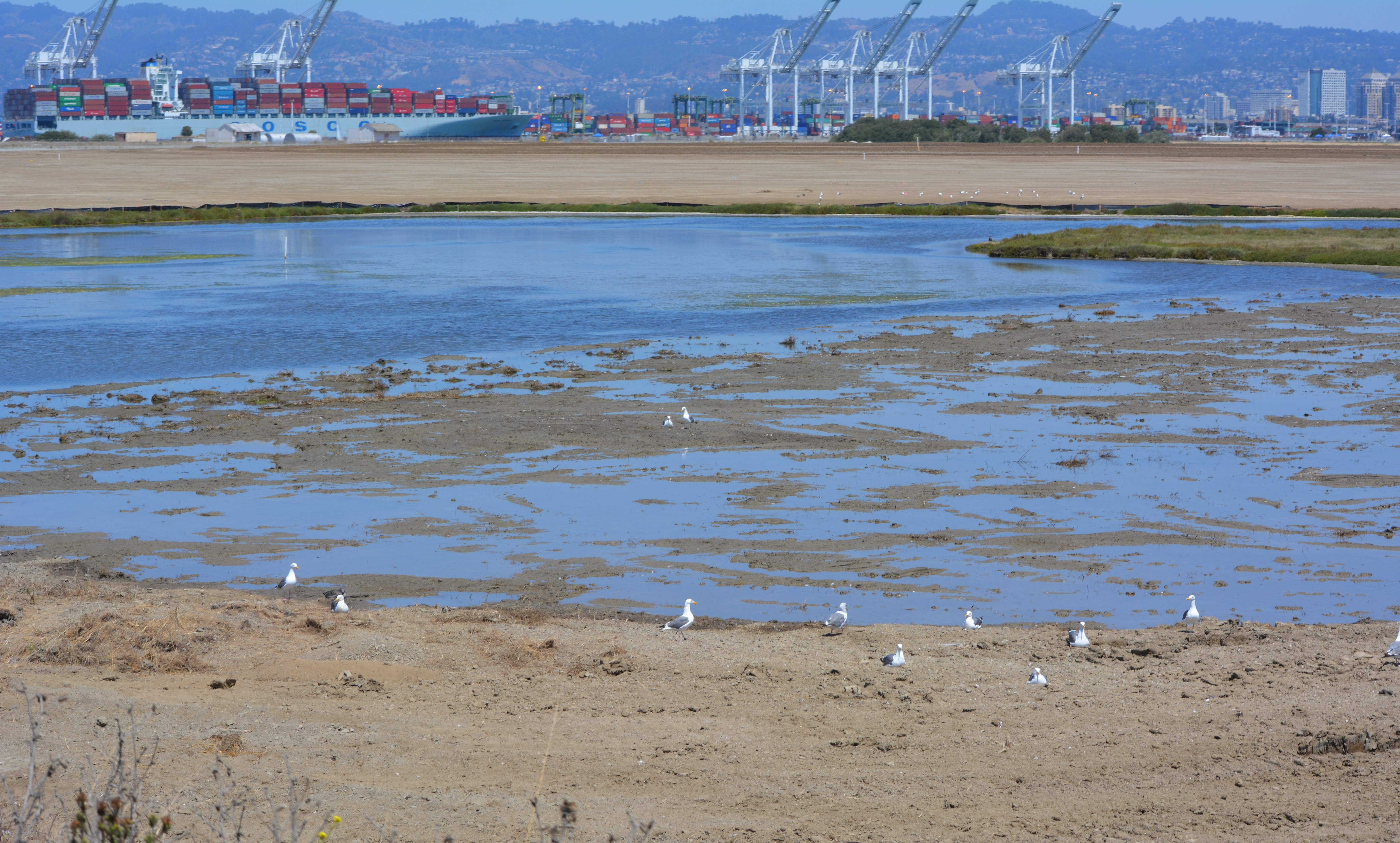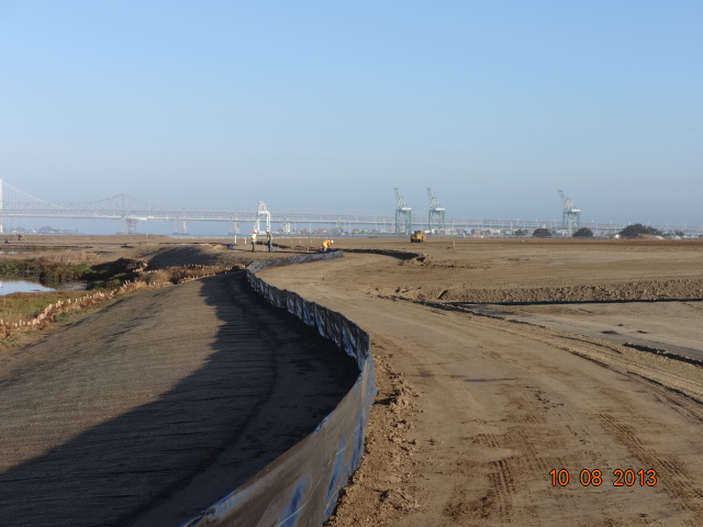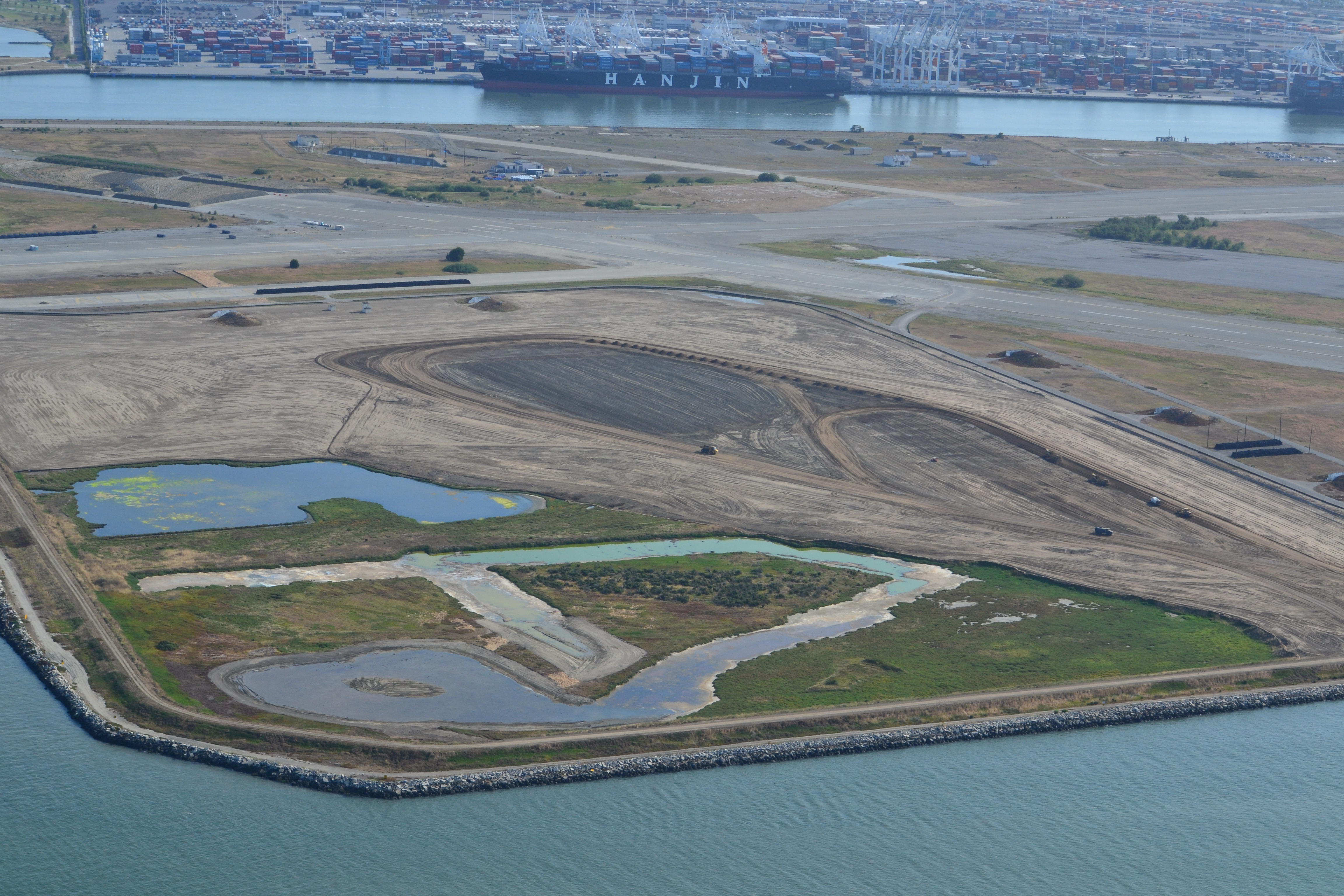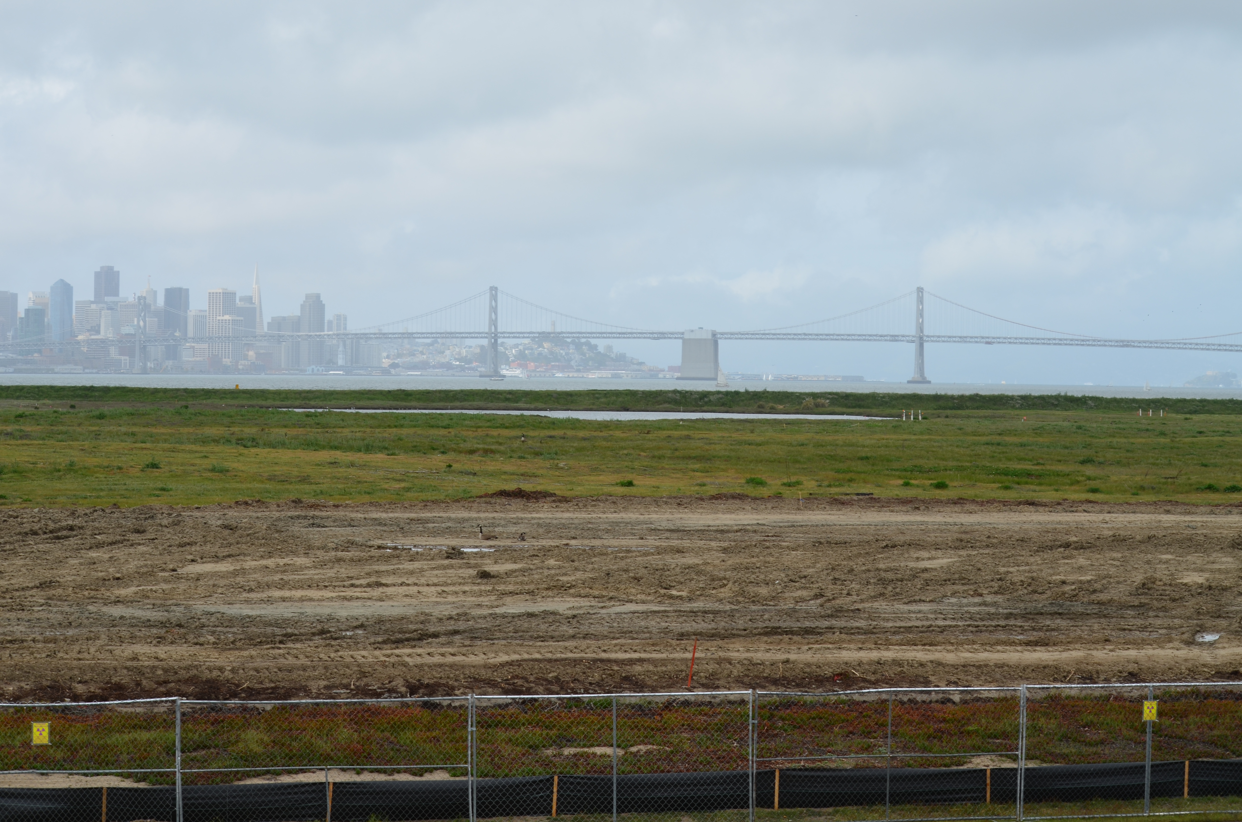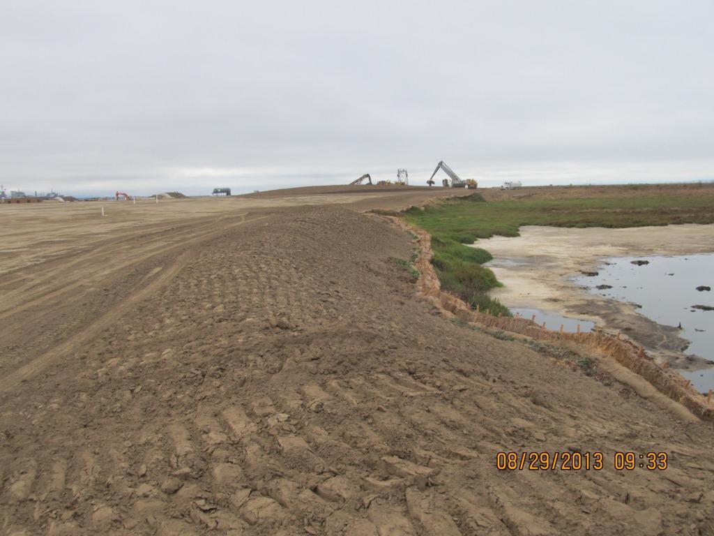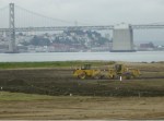 Site 2 wetland area and adjacent contouring underway in early July 2013. Wetland area has since been expanded by several acres. Port of Oakland is in the background. Bay Trail will eventually follow the foreground shoreline along the Bay. Funding and construction of the Bay Trail is not part of this project, and is yet to be funded.