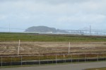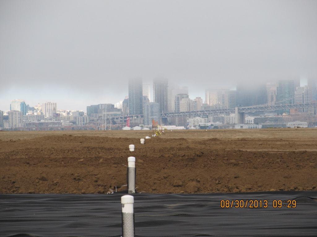 Looking east at partially completed soil cover from the western shoreline of Alameda Point.