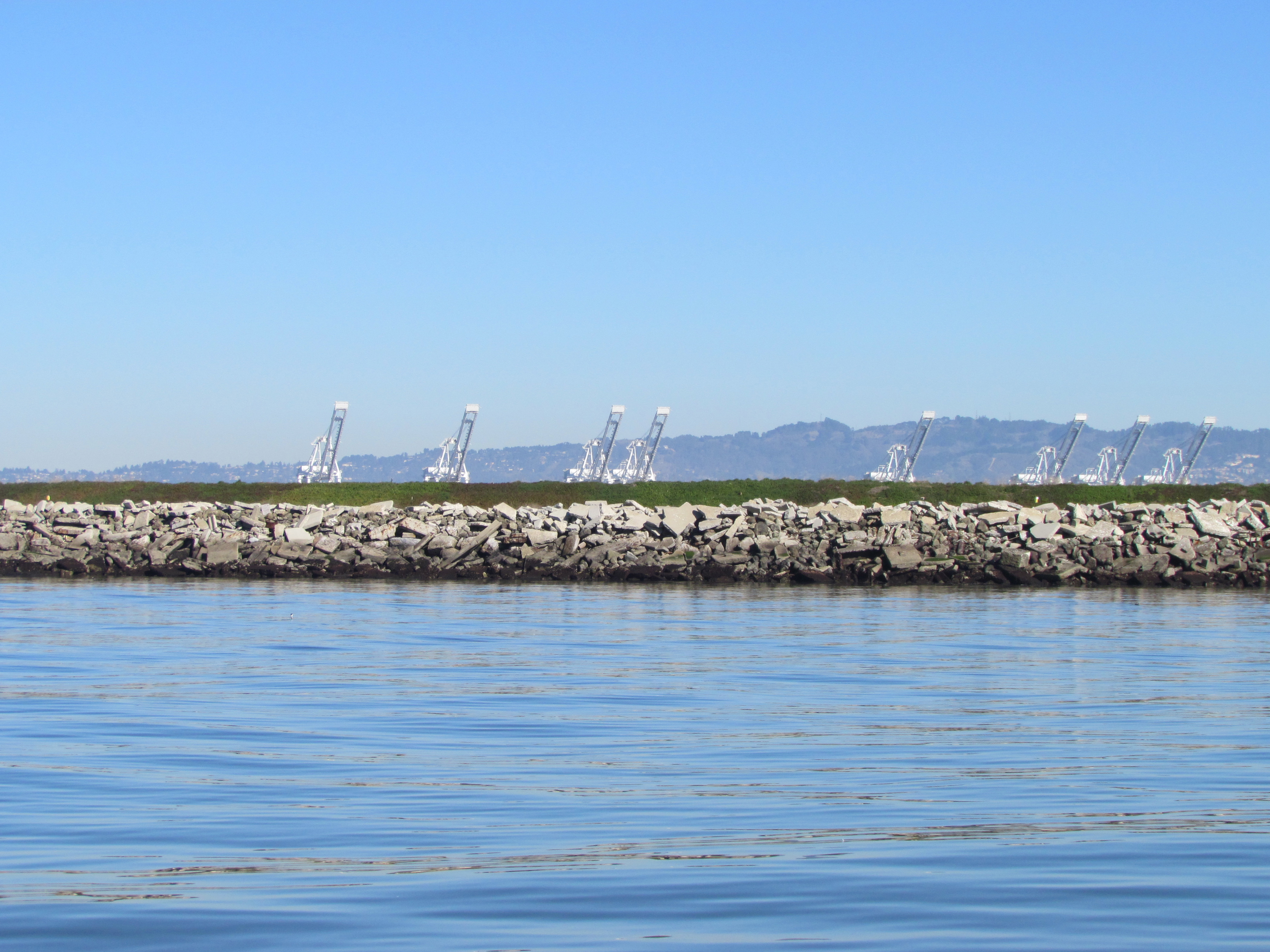 Northwest tip of Alameda Point where Site 1 is located. Waste burning area is here. Trees have been removed. Metal retaining wall will go here. Port of Oakland is in background.