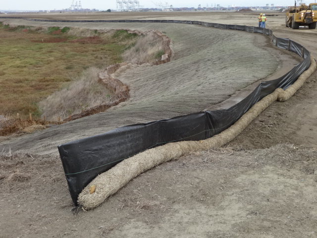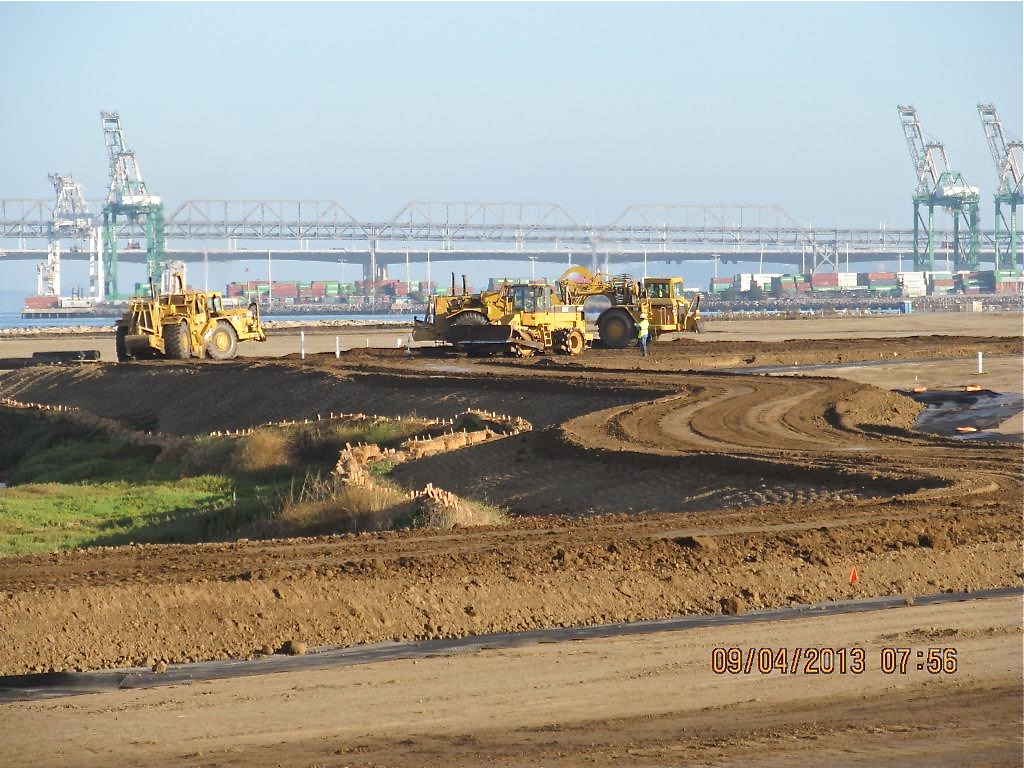The contouring of this industrial landfill site was completed on August 16, 2013. Approximately one-third of the contouring, or base layer, soil is clean soil recycled from Seaplane Lagoon dredging. The recycled soil stock was quickly exhausted, along with soil recycled after removing some of the berms and high areas. More than half of the base layer – 193,000 cubic yards – is soil barged in from Decker Island in the Sacramento River.