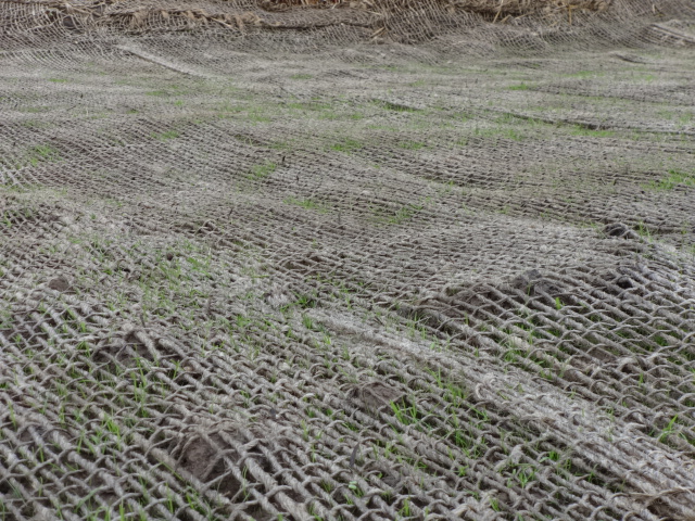 The soil stabilization and drainage work on the shoulder around the wetland area is also completed. It includes native rye grass seeding, a jute mesh cover, and a silt fence. Some of the rye grass has already started to sprout.