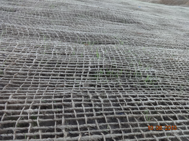 Silt fence installed above jute mesh around wetland area.Silt fence under construction.Jute mesh around wetland shoulder, with grass starting to sprout.Week 36 – Vegetation growing through jute mesh around shoulder of wetland area.