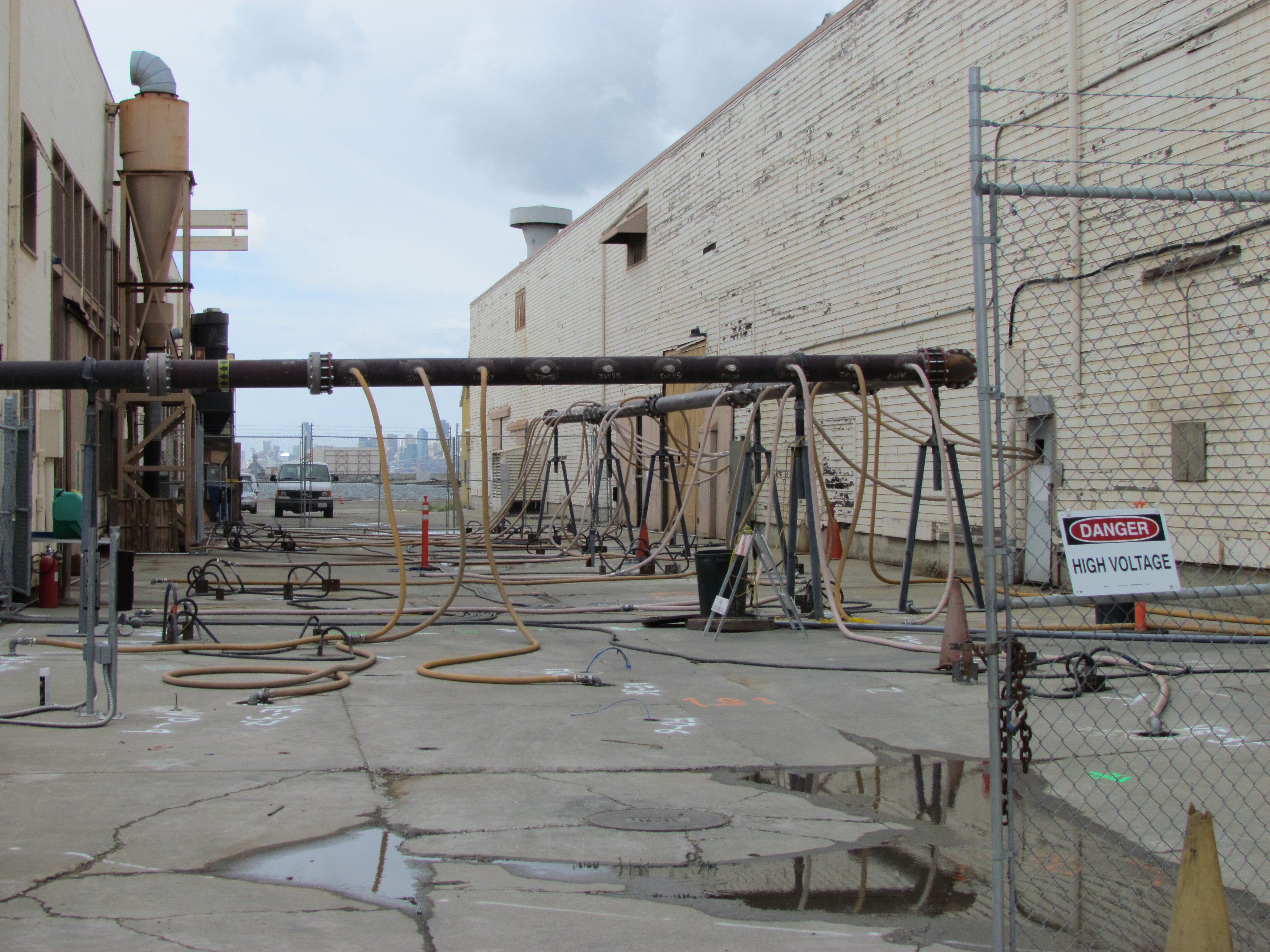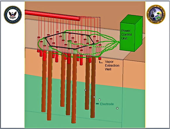 In one of the most complicated and contaminated areas to the east of the Seaplane Lagoon, cleanup work began at an area 30 feet below ground where a cleaning solvent used on aircraft parts had seeped into the groundwater. After driving a series of metal bars down to the contaminated area, the soil, groundwater, and solvent were heated to just below simmering by means of electricity. This turned the water and solvent into vapor, which was then vacuumed out into a filtering system through a series of pipes.