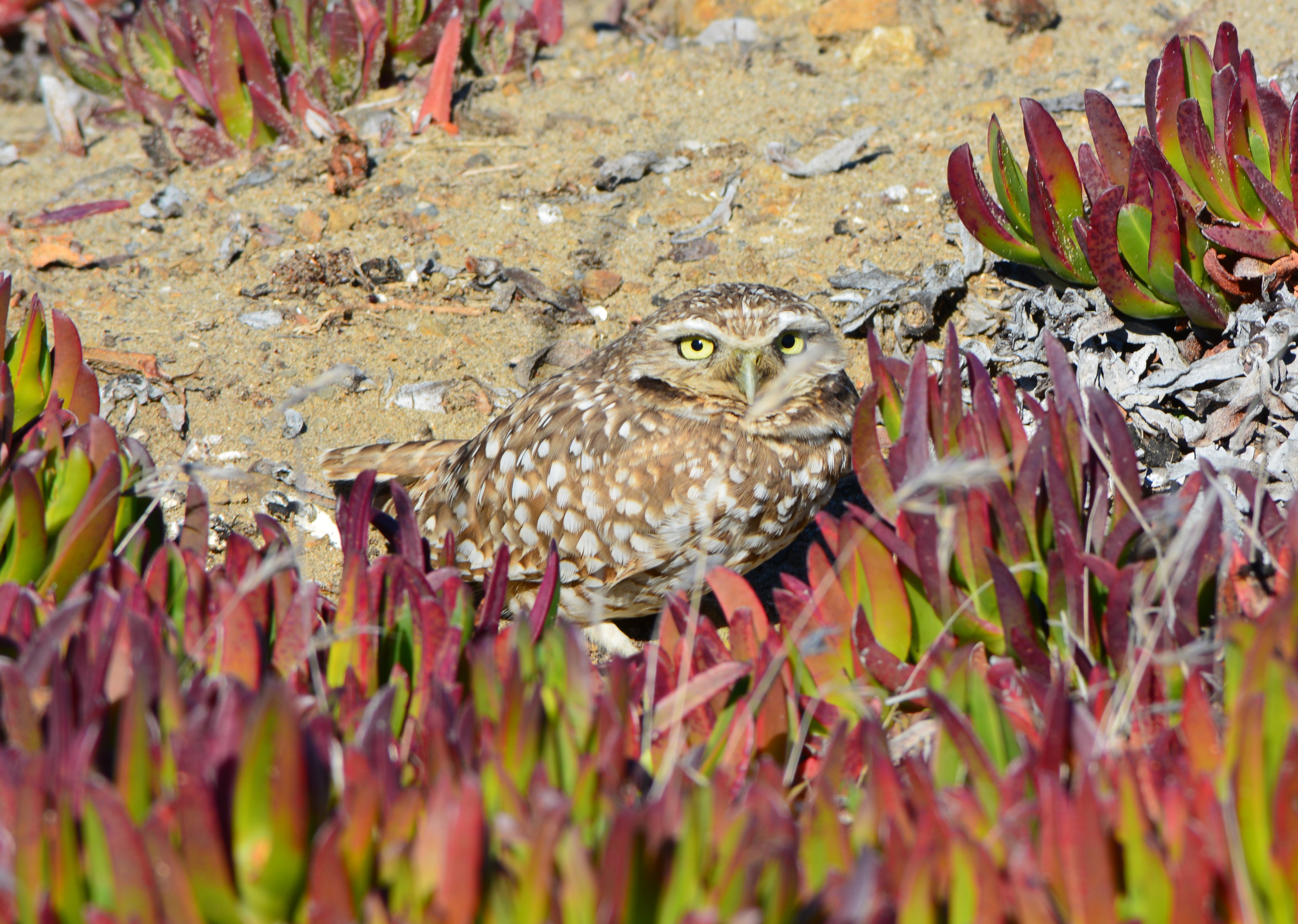 The landscaping next to the Encinal Boat Ramp restrooms has added eye appeal for humans, while providing sources of food and shelter for wildlife. Bugs, bees, and birds come and go through the seasons, taking advantage of the mulch-covered ground and different shrubs and flowers. This area and the adjacent dune and beach were enhanced by the East Bay Regional Park District in 2020.